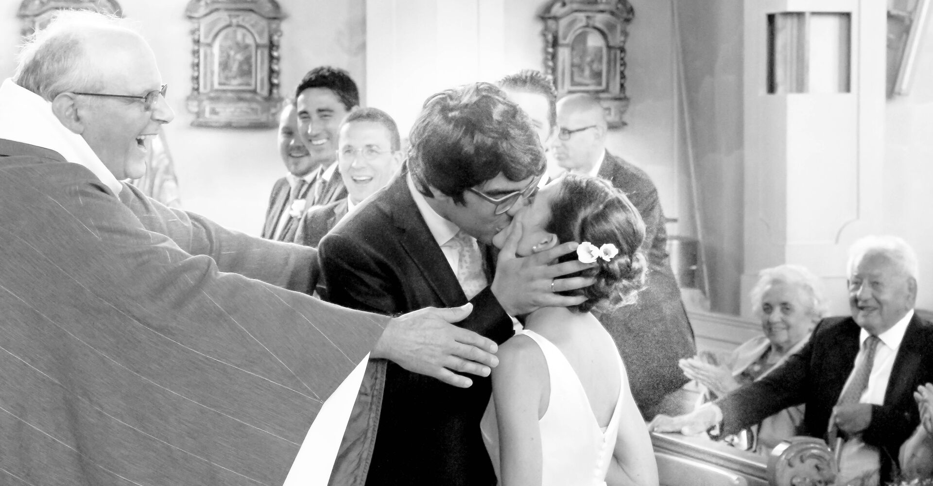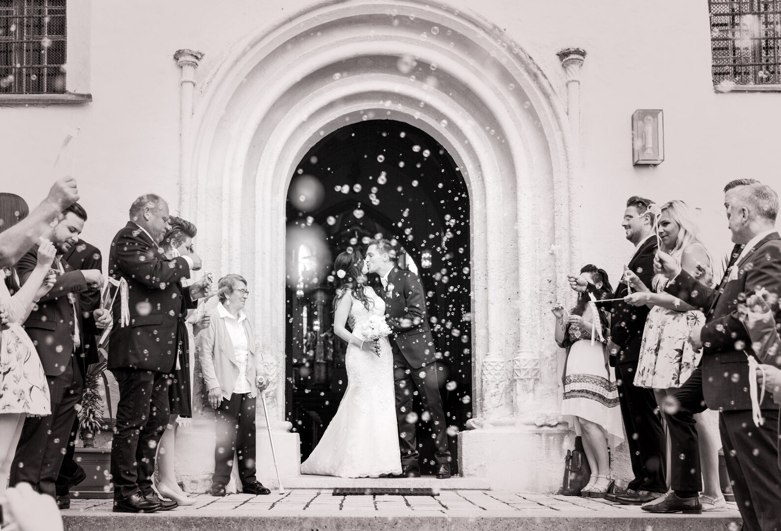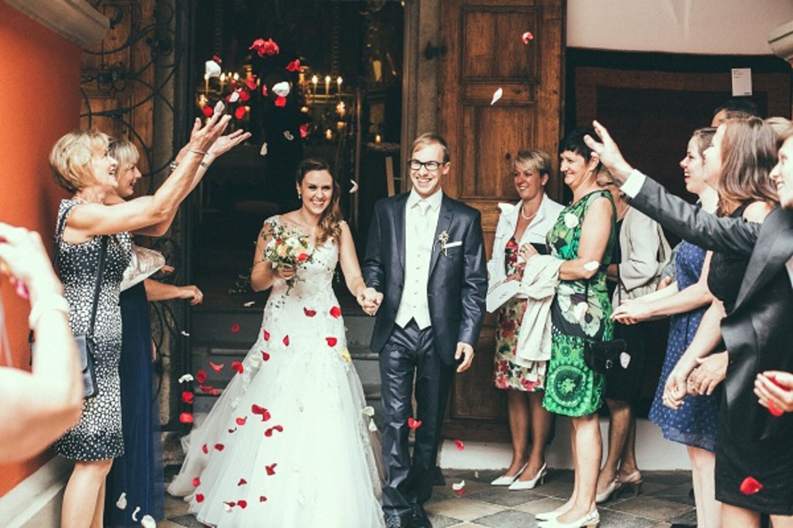 Nach der kirchlichen Trauung haben wir von der Brüstung der Kirche den Brautstrauß geworfen, der allerdings an…