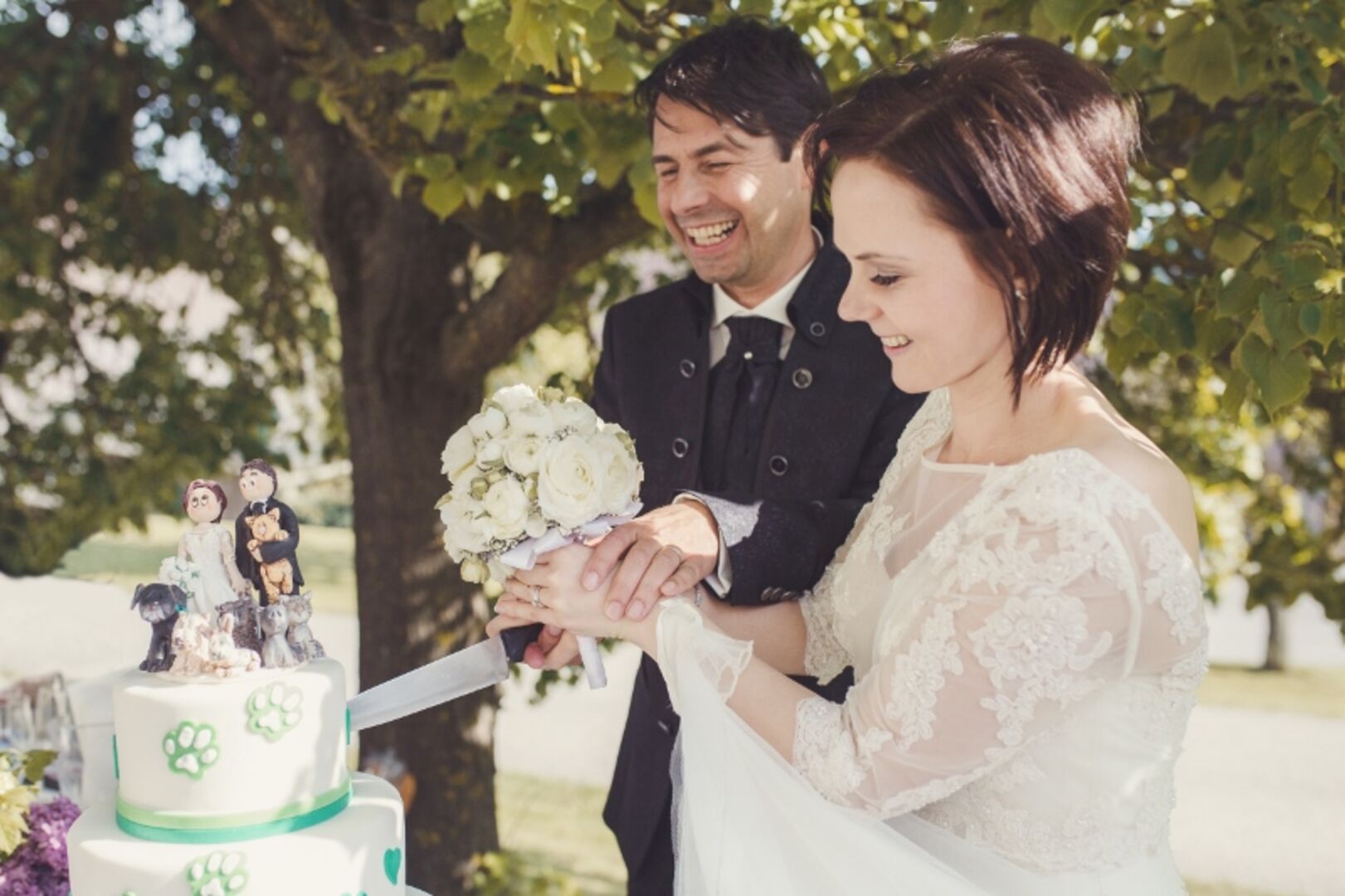 Claudia und Wolfgang Kreil-Ouschan: Agape mit Anschnitt der Hochzeitstorte in Neudenstein/Völkermarkt am 7. Mai 2016. Der schwarze Labrador Cue ist nicht nur…