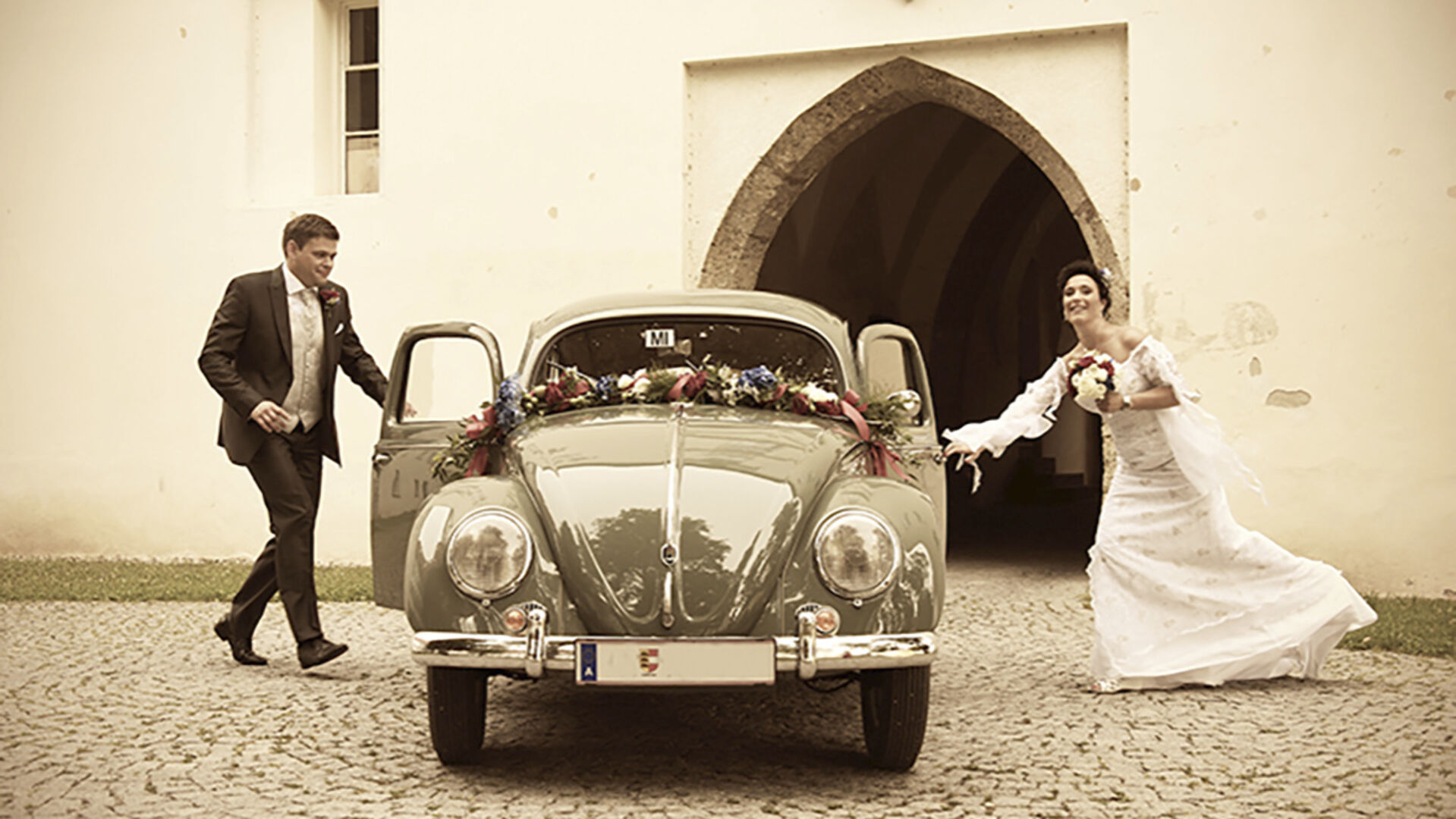 Dagmar und Franz gaben sich im Stift Viktring das Ja-Wort. Für die Feierlichkeiten wurde der Oldtimer des Brautvaters auf Hochglanz poliert!