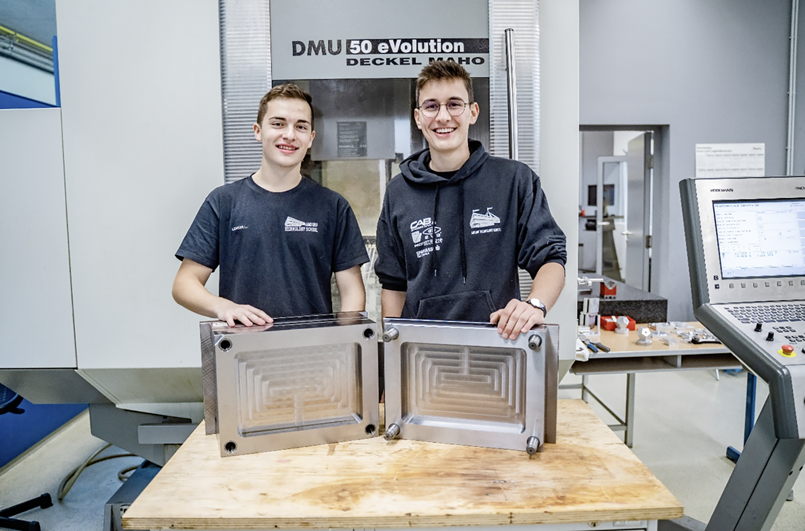 Nach vollendeter Werkzeugkonstruktion konnte mit den Vorbereitungen zur Fertigung begonnen werden. Nach Erstellung eines Fertigungsplans wurde die CAM-Programmierung durchgeführt. Vor dem Fräsen mussten noch die einzelnen Platten abgelängt und eingeschliffen werden. Anschließend erfolgte die Fertigung der formgebenden Kontur im schulinternen Maschinenpark.