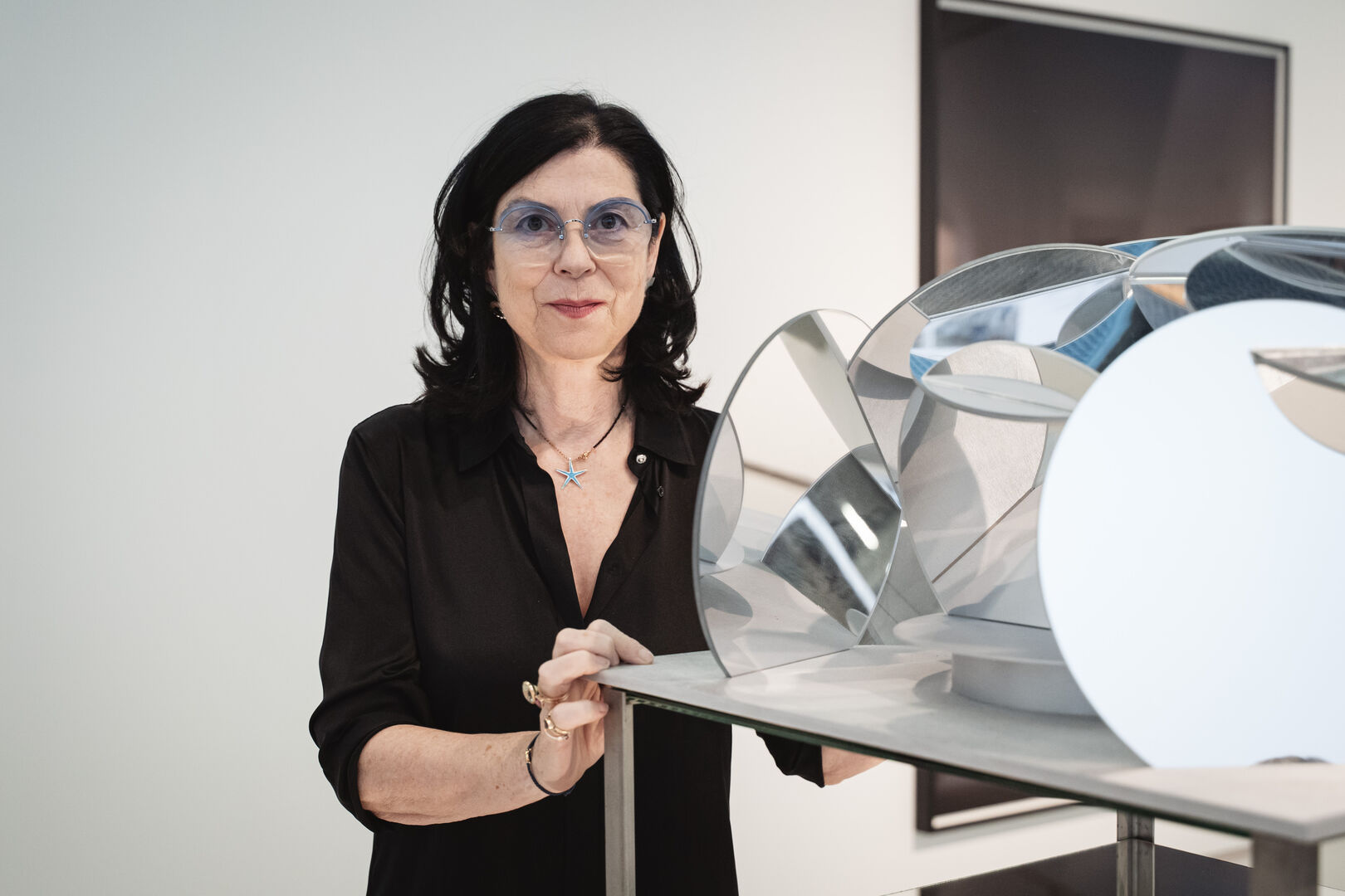 Die Künstlerin dazu: „‘Raum‘ ist das bestimmende Thema meiner künstlerischen Arbeit, der imaginäre, der architektonische, mathematische, physikalische Raum, der Weltraum, der soziologische Raum… Dieses Thema findet sich in allen Arbeiten, die in der Landesgalerie zu sehen sind, oft spiegelt sich der Betrachter in den Arbeiten, ist also Teil der Bilder und Skulpturen.“