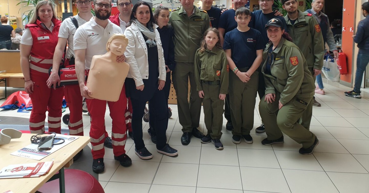 Besondere Aufmerksamkeit erregte das Reanimationsprogramm des Roten Kreuzesmit Herzdruckmassagen und vielem mehr. Hier konnten die großen und kleinen Besucher selbst Hand anlegen und die kräfteraubende Herzdruckmassage an der Übungspuppe ausprobieren. Besonders spektakulär war der Übungseinsatz mit einem „Schwerverletzten“ in einem Unfallauto, der von Feuerwehr und Rotem Kreuz gerettet werden musste. Die Zuschauer verfolgten den spannenden Blaulichteinsatz und spendeten kräftigen Applaus für die gelungene Vorführung.