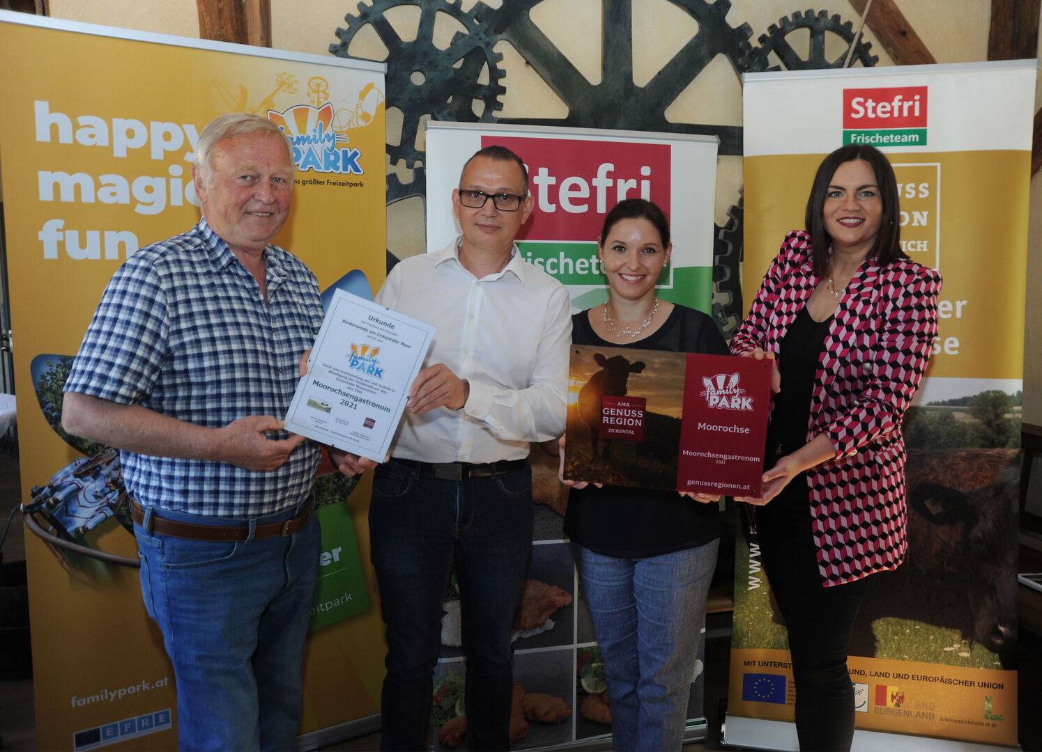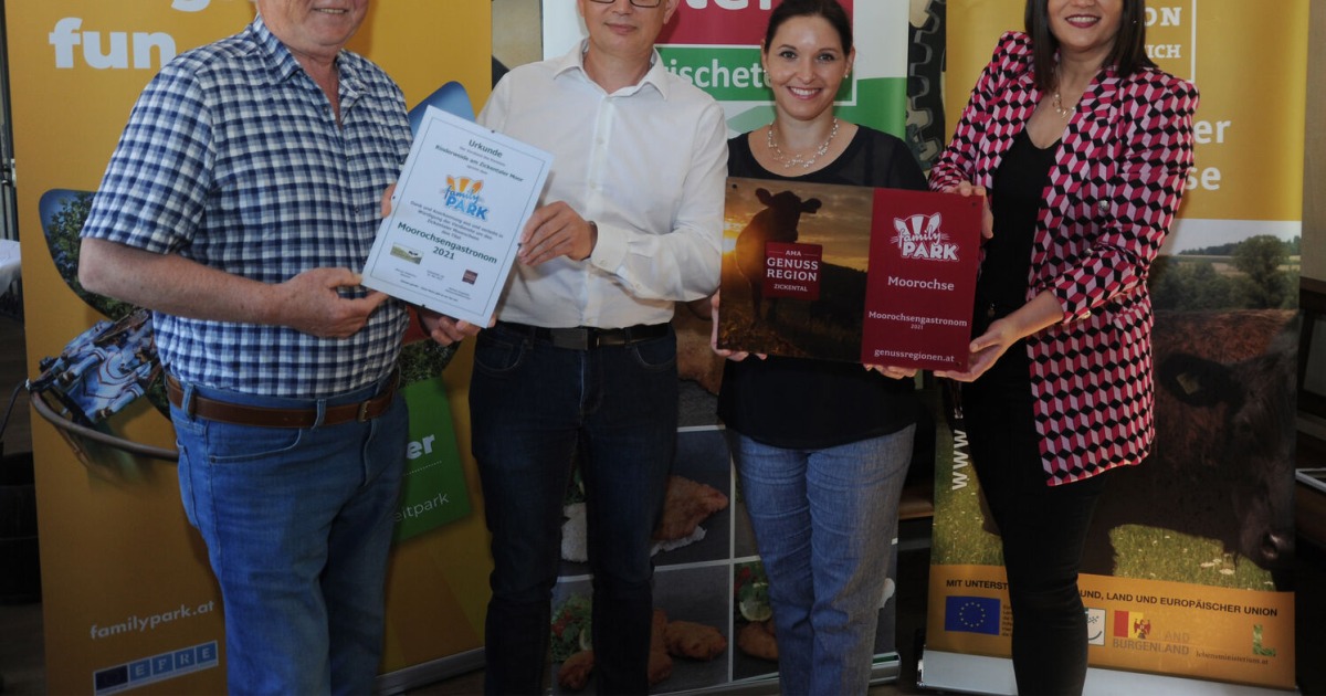 „Die Anerkennung der vorbildlichen Präsentation des Zickentaler Moorochsen und der Spezialitäten wie Moorwürstel, Burgenländer Leberkäse und insbesondere das mehrfach gefächerte Angebot von Burgern mit Moorochsenpatties durch die Geschäftsführung der Gastronomie im Familypark war dem Vorstand des Vereines „Rinderweide am Zickentaler Moor“ ein besonderes Anliegen. Damit wollten wir uns aber auch für die gute Zusammenarbeit mit unserem Vetriebspartner bedanken.“ Werner Sinkovics, Obmann.