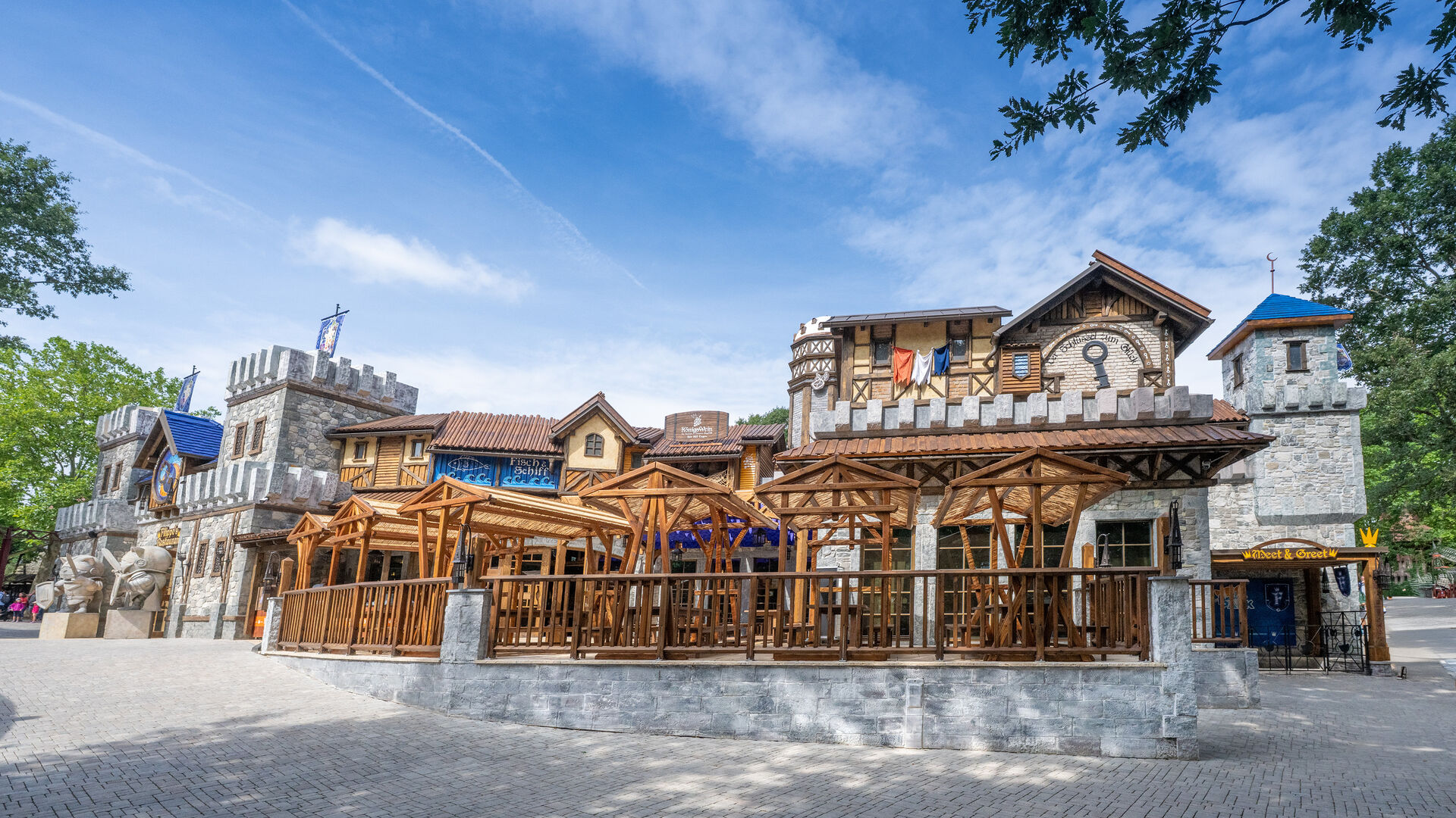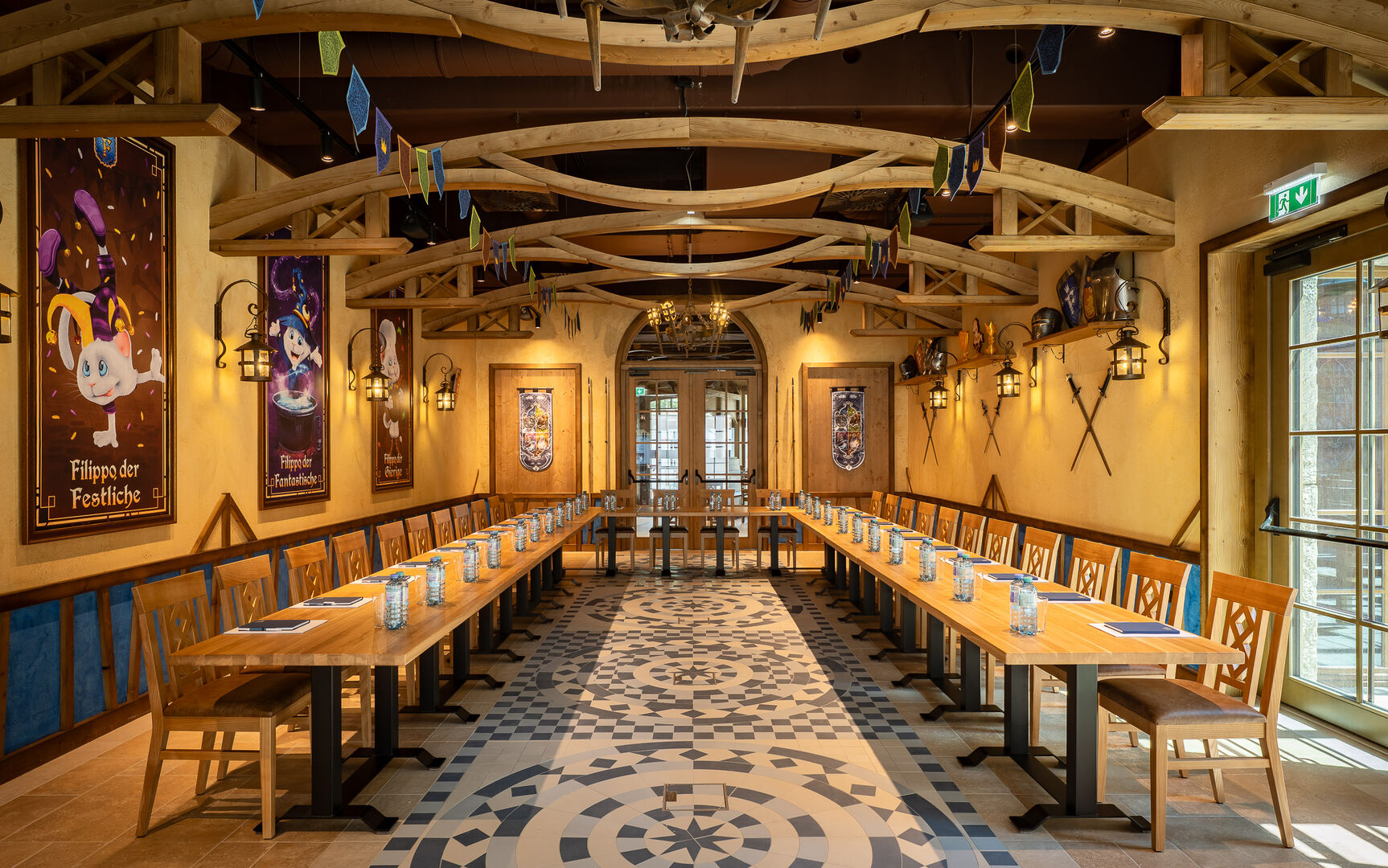 Mit Filippo’s Restaurant erhält Österreichs größter Freizeitpark ein neues gastronomisches Herzstück. Im Zentrum der mittelalterlich gestalteten Themenwelt Erlebnisburg gelegen, fügt sich das Konzept nahtlos in das bestehende Areal ein. Die Architektur erinnert an eine imposante Ritterburg mit Zinnen, Türmen und atmosphärischem Vorplatz, während der Außenbereich als mittelalterlicher Marktplatz inszeniert ist – inklusive Outdoor-Küche. Auch der Innenraum überrascht mit detailreicher Gestaltung, burgsaalartigen Räumen und einem Indoorspielplatz im Stil einer Ritterburg.