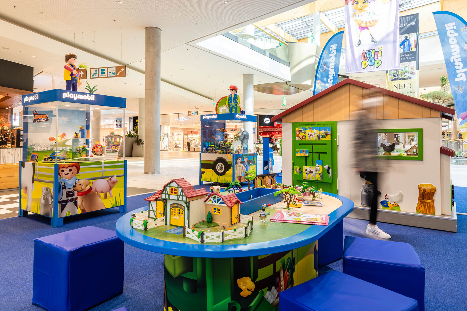 Besonderes Highlight ist das große Bauernhofgebäude, welches in der Schauvitrine ausgestellt wird und voller Details und liebevoll gestalteter Szenerien steckt. Weitere Programmpunkte wie Puzzles, Animationsfilme und der bunte Spieltisch verwandeln den Eventplatz des Centers in eine XL-Erlebniswelt voll Spiel & Spaß für die ganze Familie.