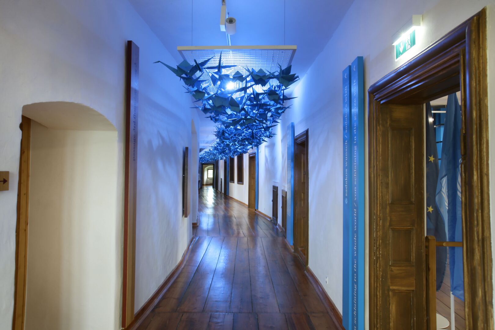 Die Ausstellung „Schlaining & Frieden“ erstreckt sich über mehrere Räume im dritten Obergeschoß und bietet einen umfassenden Überblick über die vielfältigen Facetten von Friedensbildung und -erhaltung. Diese reichen von der bewegenden Geschichte Sadakos und ihren Kranichen über die friedensbildenden Methoden bis hin zur globalen Perspektive auf unsere Erde als gemeinsames Heimatland.