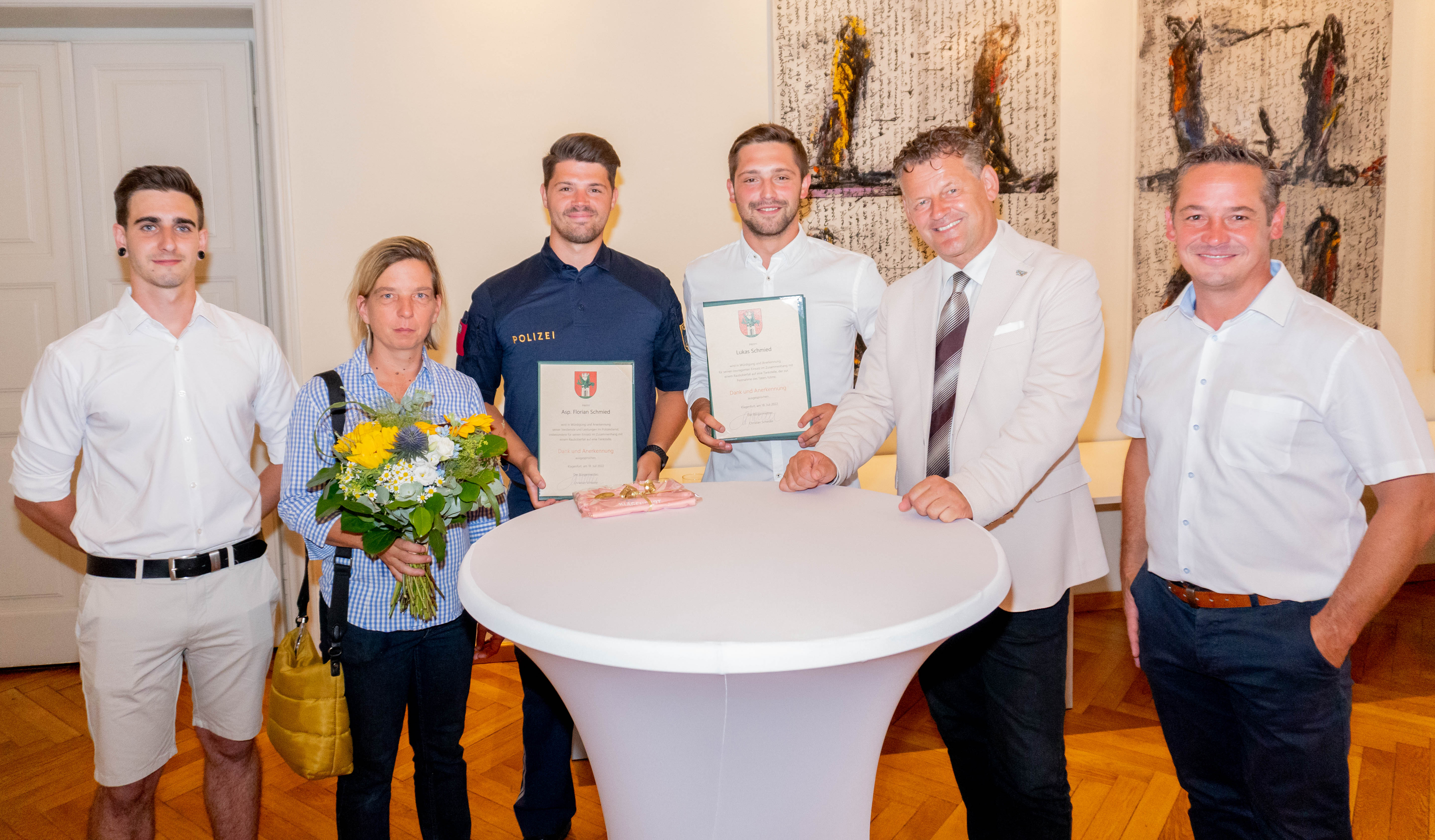Für ihren Einsatz im Dienste der Sicherheit in der Landeshauptstadt Klagenfurt wurden Lukas und Florian Schmied sowie Inspektor Christoph Metschitzer mit der Dank- und Anerkennungsurkunde der Landeshauptstadt Klagenfurt geehrt. Aufgrund seiner bevorstehenden Vaterschaft bekam Metschitzer ebenfalls einen Babystrampler geschenkt, er selbst war bei der Ehrung nicht anwesend. Denis Jamnik und Claudia Sekoll erhielten für ihre Tapferkeit während des Überfalls Badetücher und Blumen.