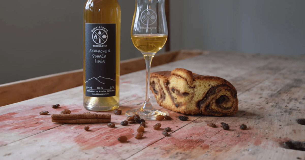Rosinen, Nüsse und ein Hauch von Zimt: „Pohača“ – der Kärntner Reindling – geht auch in flüssiger Form. Nämlich als edler Likör! Wer auf die Idee gekommen ist? Martina Poganitsch und Benjamin Unterzaucher aus Ferlach, die vor drei Jahren ihre Destillerie Brenngeist ins Leben gerufen haben und nun in Ferlach produzieren.