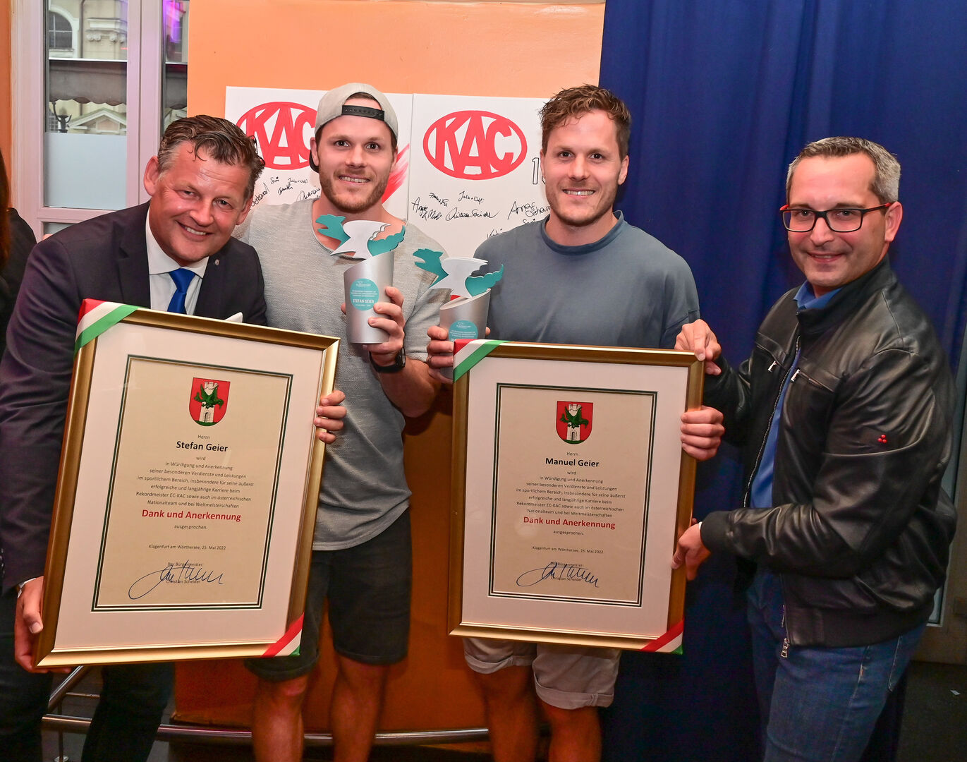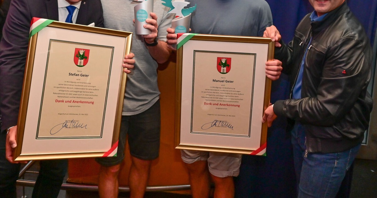 14 Jahre lang sah man sie im Dress der Rotjacken – nun hängen Manuel und Stefan Geier ihre Schlittschuhe an den berühmten Nagel. Vier Meistertitel (2009, 2013, 2019, 2021) haben die Brüder in petto, insgesamt gab es für sie 1593 Einsätze. Im bekannten Klagenfurter Nachtlokal Teatro fand nun eine Überraschungsparty für die Geier-Zwillinge statt. Bürgermeister Christian Scheider überreichte den beiden gebürtigen Steirern für ihre Leistungen und Verdienste im Eishockeysport die Dank- und Anerkennungsurkunde. Außerdem erhielten sie das Sportehrenzeichen für besondere Verdienste.