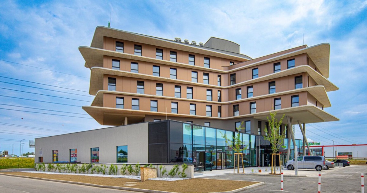 Das neue Hotel mit der markanten Architektur bietet auf fünf Geschossen 104 Zimmer und im Erdgeschoss einen noch in Fertigstellung befindlichen Foodcourt mit fünf Restaurants, deren gastronomisches Angebot sich nicht nur an die Hotelgäste, sondern an alle Beschäftigten und BesucherInnen des IZ NÖ-Süd und der umliegenden Gemeinden richtet. Insgesamt sind 88 Stellplätze vorhanden, 51 davon in der hoteleigenen Tiefgarage.