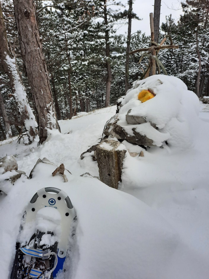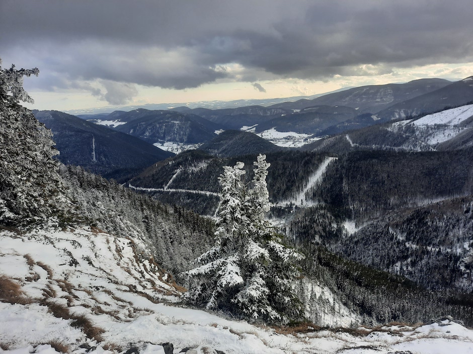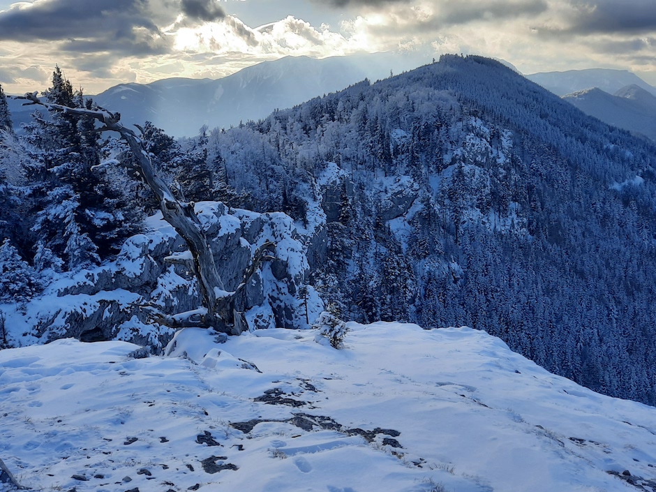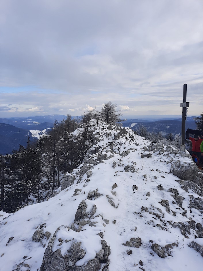 Grödeln sollte man bei entsprechender Schneelage immer mithaben, diese „Schneeketten“ für die Schuhe brauchen keinen Platz, sind aber im Falle des Falles und vor allem bei eisigen Wegen sehr hilfreich. Etwa wenn man vom Öhlerkreuz zum Schoberkreuz weitergeht und dabei den atemberaubend schönen Schoberkamm überschreitet. Auf der anderen Seite ist auch die Dürre Wand, in diesem Fall mit dem Plattenstein als Gipfelziel, eine beliebte Winterroute. Im Gegensatz zum Herbst, wo auch dort der Ausnahmezustand herrschte, ist die Zahl der Wanderer im Winter überschaubar. Geht man den langen Weg vom Öhlerkreuz über den Katharinenschlag, wird man nur ganz wenige Gleichgesinnte treffen.