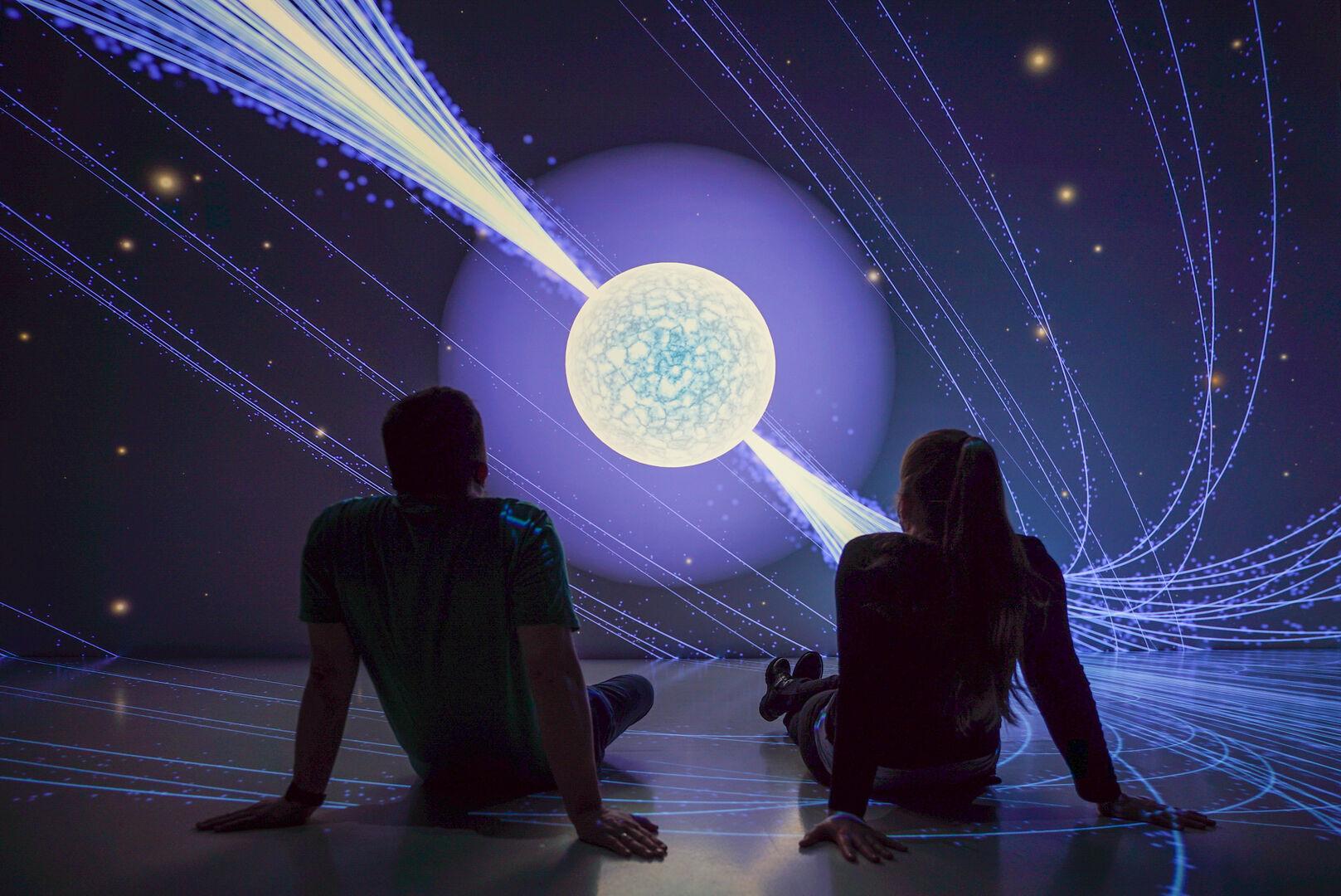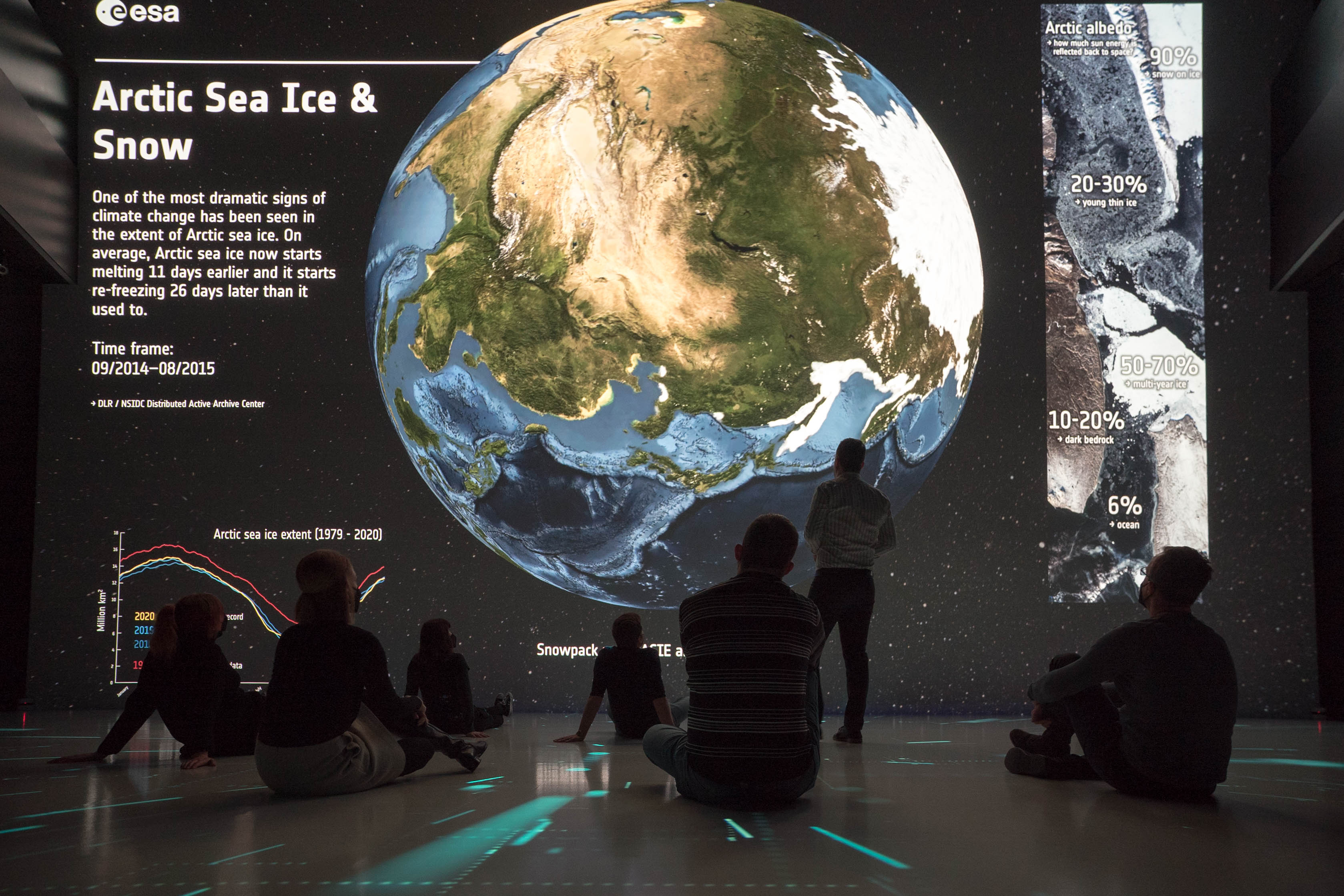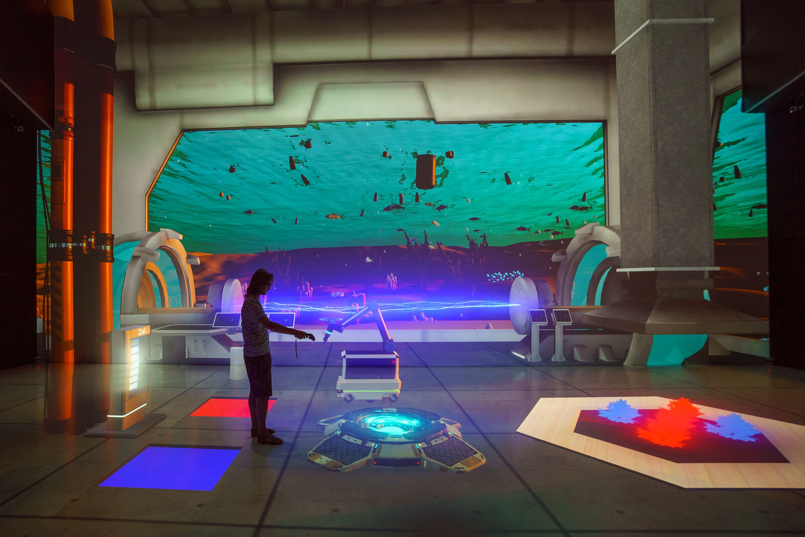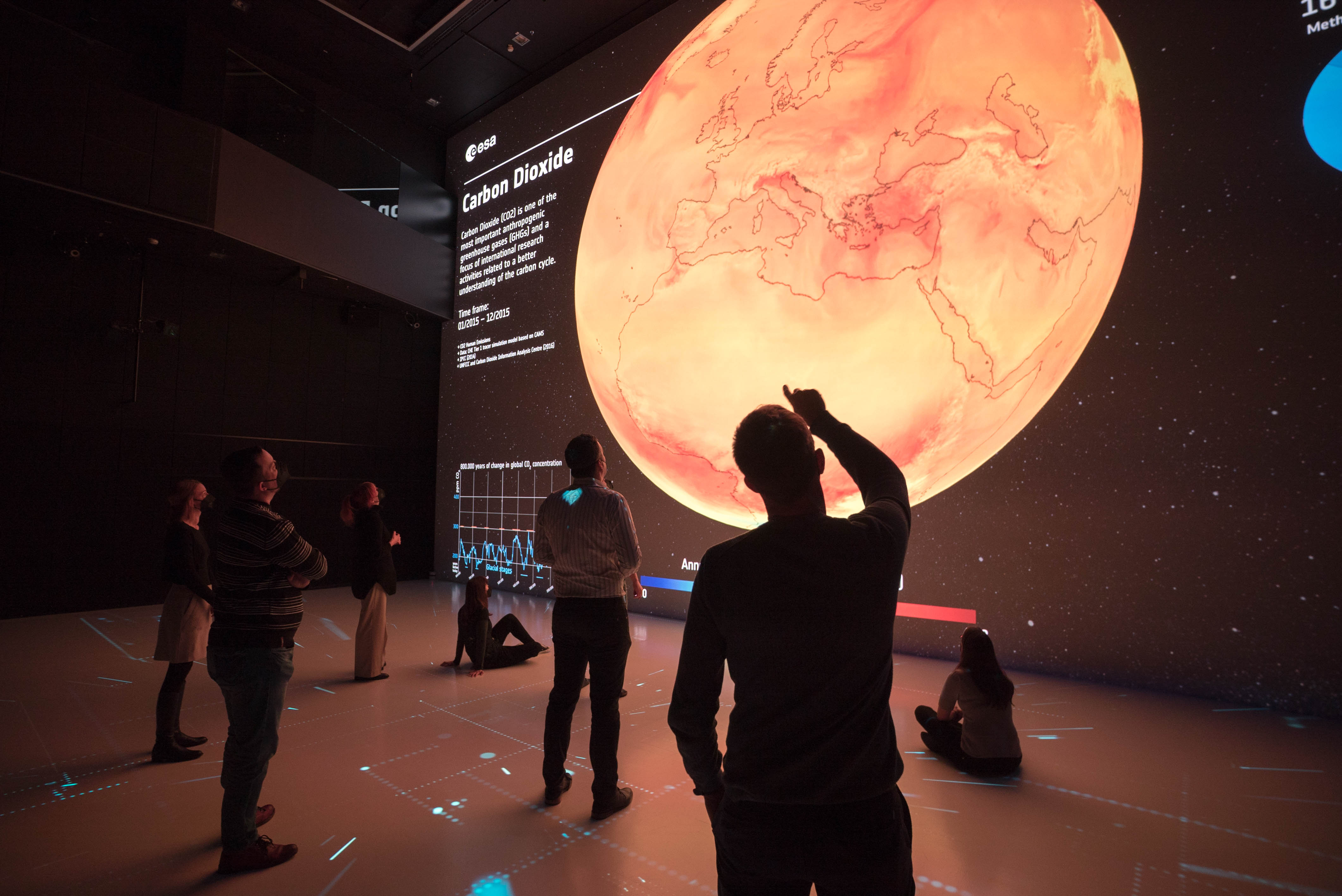 Besucher können sich unter anderem auf eine Reise durch das Sonnensystem begeben und erfahren, warum sich Leben auf der Erde überhaupt entfalten kann. Sie können Entscheidungen treffen, die die Klimaentwicklung auf dem fiktiven Planet B beeinflussen oder den komplexen Aufbau des menschlichen Organismus sehen. Welches Potenzial im Zusammenspiel von Mensch und Maschine steckt, zeigt außerdem das 3D-Video „Sounding Letters“, das auf einem KI-System basiert.