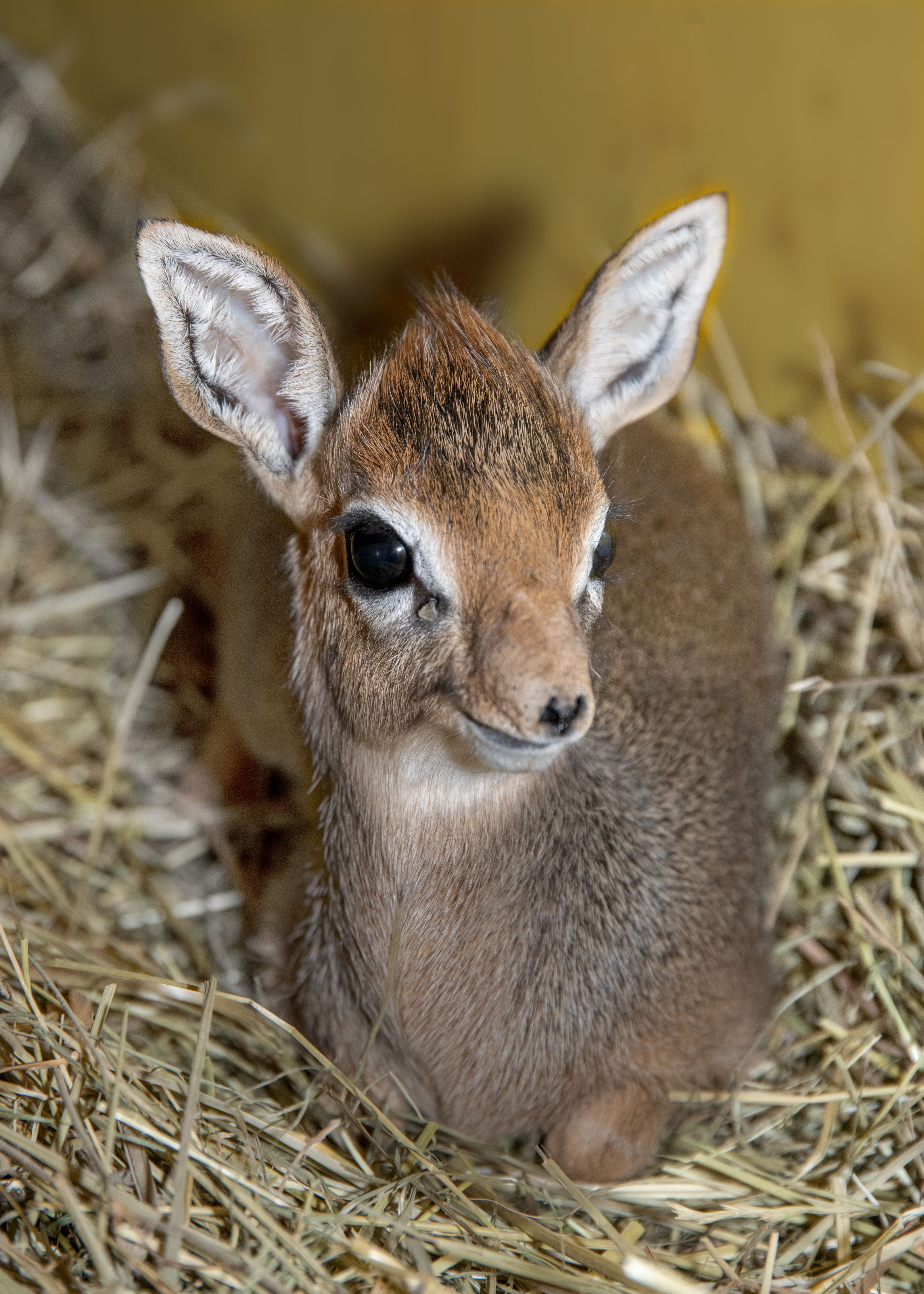 Die winzige Antilope mit den großen Kulleraugen kam nach einer Tragezeit von etwas über fünfeinhalb Monaten auf die Welt und wog bei der Geburt noch keinen ganzen Kilo. Sie sind nur wenig größer als Feldhasen und gehören mit einer Schulterhöhe von nur 45 Zentimetern und einem Gewicht von maximal 6,5 kg zu den kleinsten Vertretern der Antilopen“, erklärt Zoologin Daniela Artmann. „Sie haben eine braune Fellfarbe und ganz kleine Hörner, die sogar kürzer als ihre Ohren sind.“