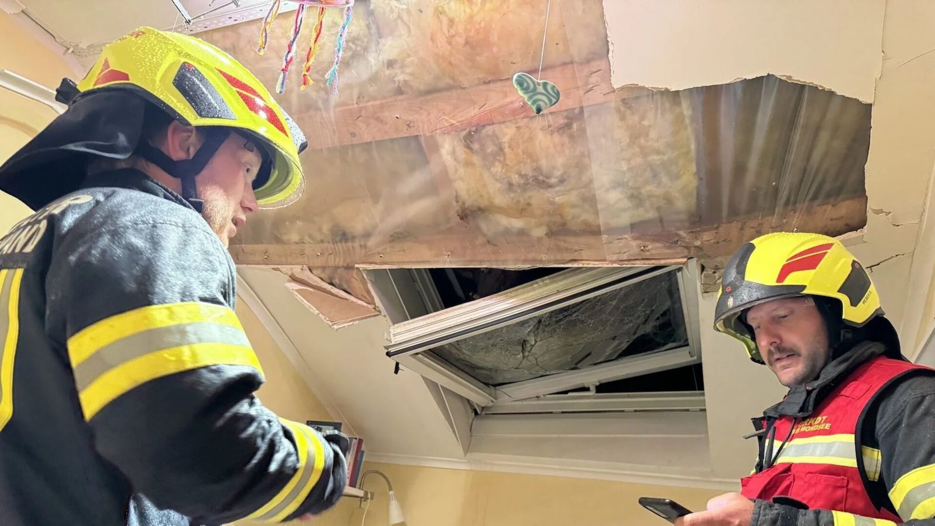 In der Ortschaft Auhof ist gegen 20.00 Uhr ein großer Baum auf das Dach eines Wohnblocks gestürzt und ist genau an der Stelle aufgeschlagen, an der ein Dachfenster ist – direkt darunter befindet sich das Bett von zwei Kindern. Zum Glück befindet sich die sechsköpfige Familie zu diesem Zeitpunkt einen Stock tiefer beim verspäteten (!) Abendessen. Die Einsatzkräfte konnten schnell Entwarnung geben: Niemand ist verletzt worden!