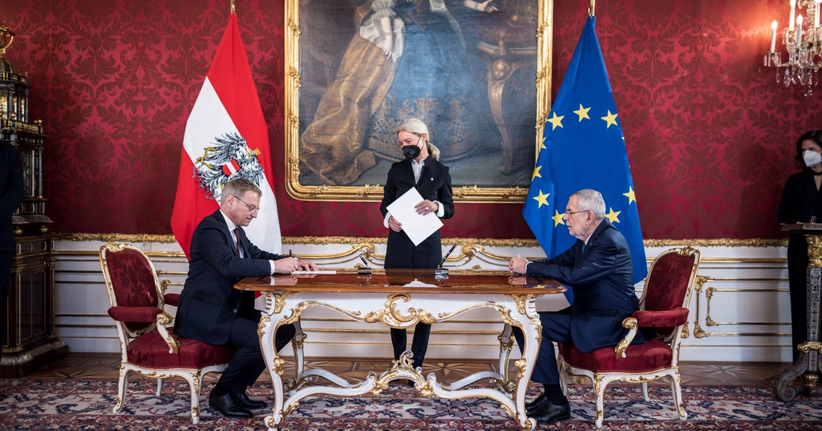 Nach einem Gespräch im Arbeitszimmer wurde Mag. Thomas Stelzer im offiziellen Zeremonienzimmer der Wiener Präsidentschaftskanzlei, dem Maria-Theresien-Zimmer, am Mittwoch, 27. Oktober 2021, von Bundespräsident Dr. Alexander Van der Bellen offiziell als Landeshauptmann von Oberösterreich angelobt.