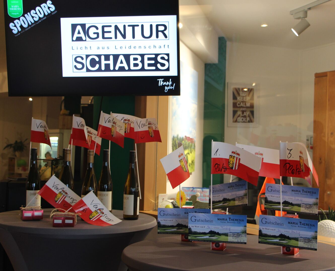Worum geht's beim Fähnchenturnier? Nun: Das Ziel ist, sein persönliches Fähnchen am längsten mitzuführen, bevor die vergebene Schlagzahl (die sich zusammensetzt aus Par plus PHCP) erreicht ist. Für jene fünf, die als letztes ihre Fahne gesteckt haben, waren dank Christian Nimmervoll und Harald Schabes Restaurantgutscheine, Bälle und Honig vorbereitet.