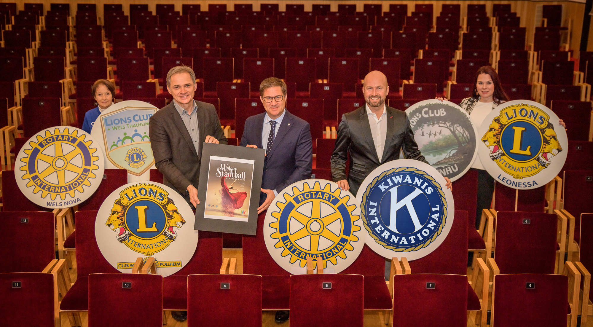 (V. li.:) Renate Pyrker (Lions Club Thalheim), Peter Jungreithmair, GF Wels Marketing & Touristik GmbH, Bürgermeister Andreas Rabl, Christoph Hippmann und Claudia Lienhard-Lehner (Lions Club Wels Leonessa) freuen sich auf das Ball-Comeback.
