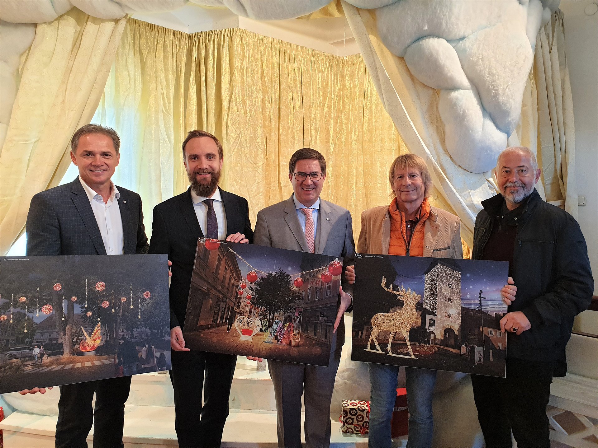 V. li.: GF Wels Marketing & Touristik GmbH & Welser Christkind GmbH Peter Jungreithmair, StR. Martin Oberndorfer, Bgm. Andreas Rabl, Jörg Wanik (Gösser Biergarten Advent), KR Helmut Platzer (Aufsichtsratsvorsitzender Tourismusverband Region Wels).
