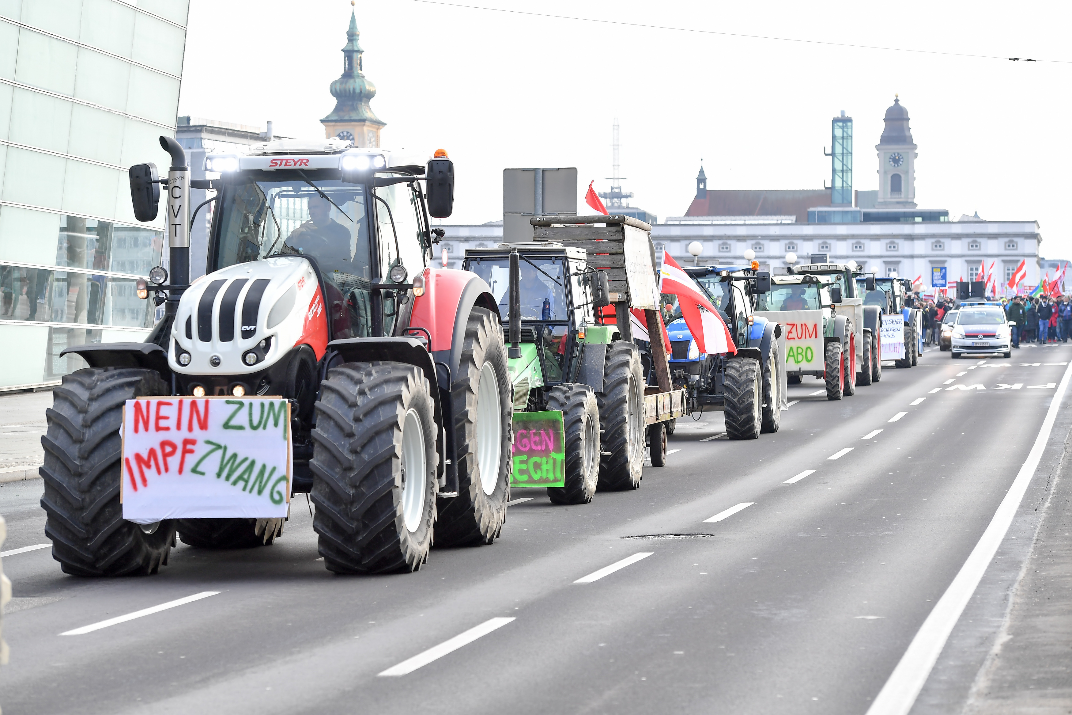 Angeführt von 13 Traktoren marschierten gestern Nachmittag laut Polizeiangaben rund 4.000 Demonstranten quer durch Linz: Vom Hauptplatz zur Promenade durch den Römerbergtunnel auf die Obere Donaulände, weiter über die Gruberstraße bis zum Europaplatz, wo es anschließend Richtung Hauptbahnhof ging. Gegen 16 Uhr wurden die Traktoren auf Höhe Landesdienstleistungszentrum abgestellt, der Fußmarsch zog weiter zur Abschlusskundgebung am Bahnhofplatz.