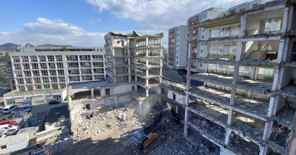 Am Dienstag dieser Woche wurden zwei Bagger mit zirka fünf Tonnen Gewicht von einem Spezialkran auf das oberste Geschoß des zehnstöckigen Hochhauses gehoben, sie „fressen“ sich von oben nach unten durch. Damit der Verkehr weiterhin sicher fließen kann, hat man sich für diese kontrollierte Art des Abrisses entschieden. Der Riesenkomplex, der hier auf möglichst schonende Art verschwinden soll, beherbergte bis vor kurzem etliche Ämter der Landesregierung sowie die Bezirkshauptmannschaft Salzburg-Umgebung.