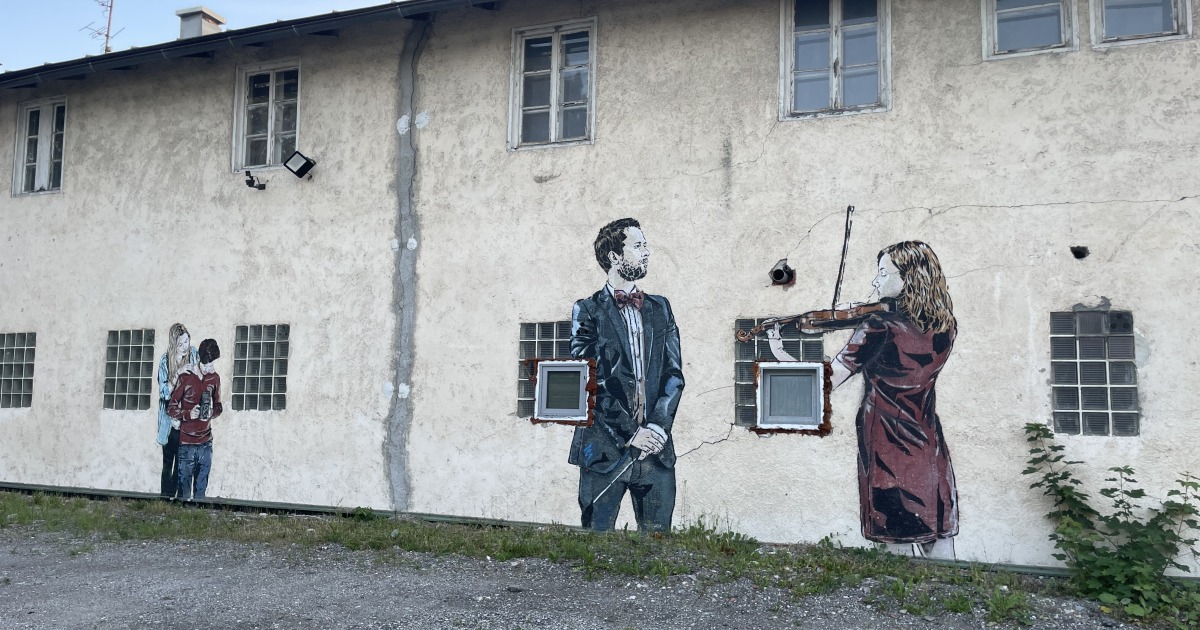 Biegt man nun wenige Meter weiter rechts auf den Schotterplatz ein, bekommt man an der Rückwand des Gebäudes ein großes, imposantes Werk zu sehen – unser Highlight der Salzburger Street Art-Tour. Mit den zwei Musiker-Porträts haben sich auch hier „jana & js“ verewigt.