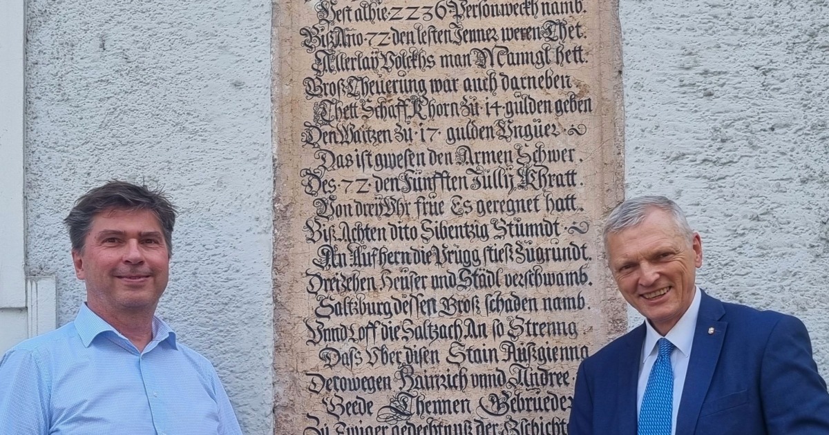 Angebracht an der Ostwand des Museums direkt vor dem Kreisverkehr, erinnert die Tafel an ein schlimmes Jahr der Stadtgeschichte. Die etwas schwer zu entziffernde Inschrift berichtet von einem verheerenden Hochwasser am 5. Juli 1572. Nach 70 Stunden Dauerregen hatte die unregulierte Salzach die einzige Stadtbrücke und 13 Häuser weggerissen. Gestiftet wurde die Marmortafel noch im Jahr des Unglücks von dem Salzburger Münzpächter-Brüderpaar Hainrich und Andree Thenn, die „Zu ewiger Gedächtnis der Geschichten diesen Stein haben lassen aufrichten“.