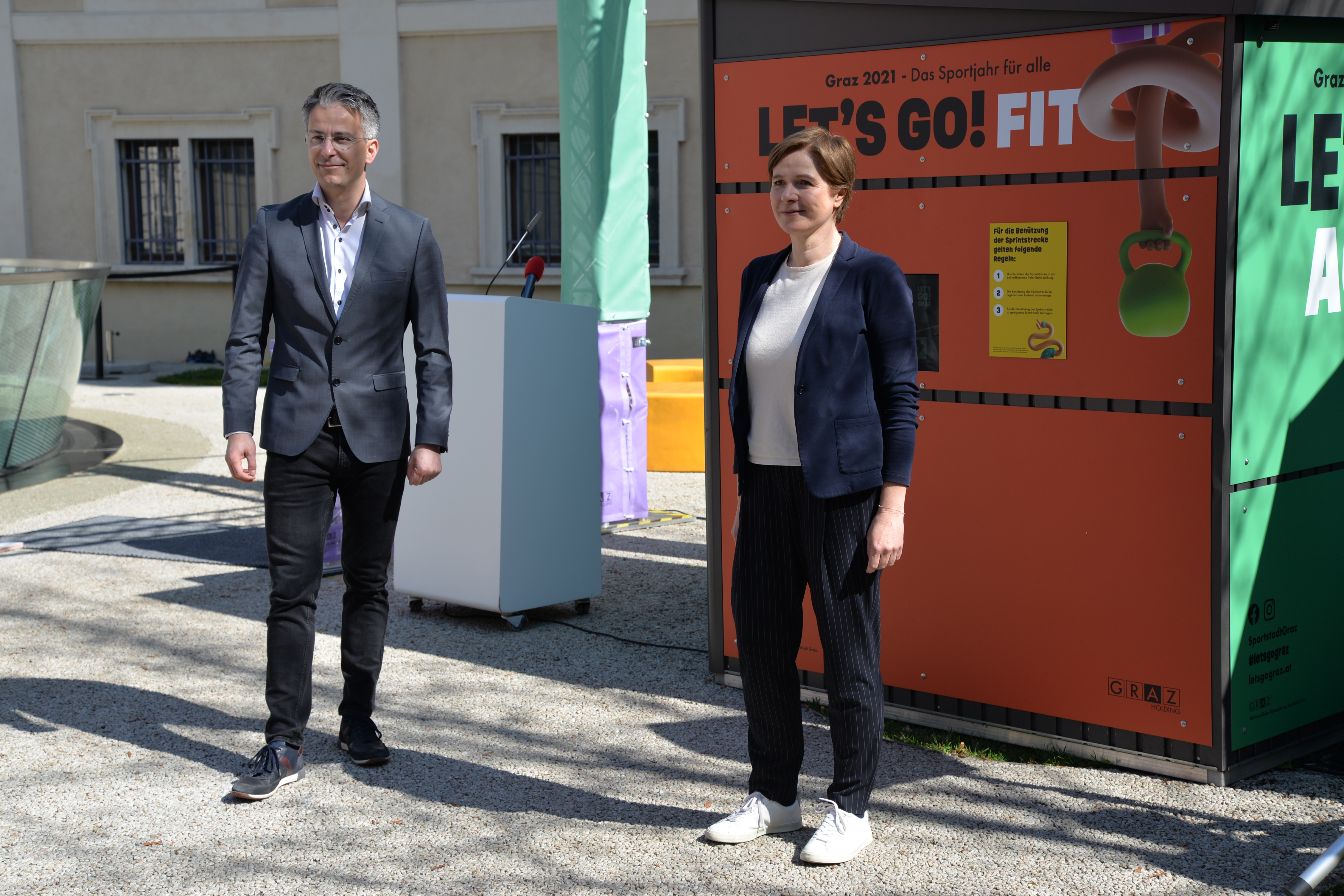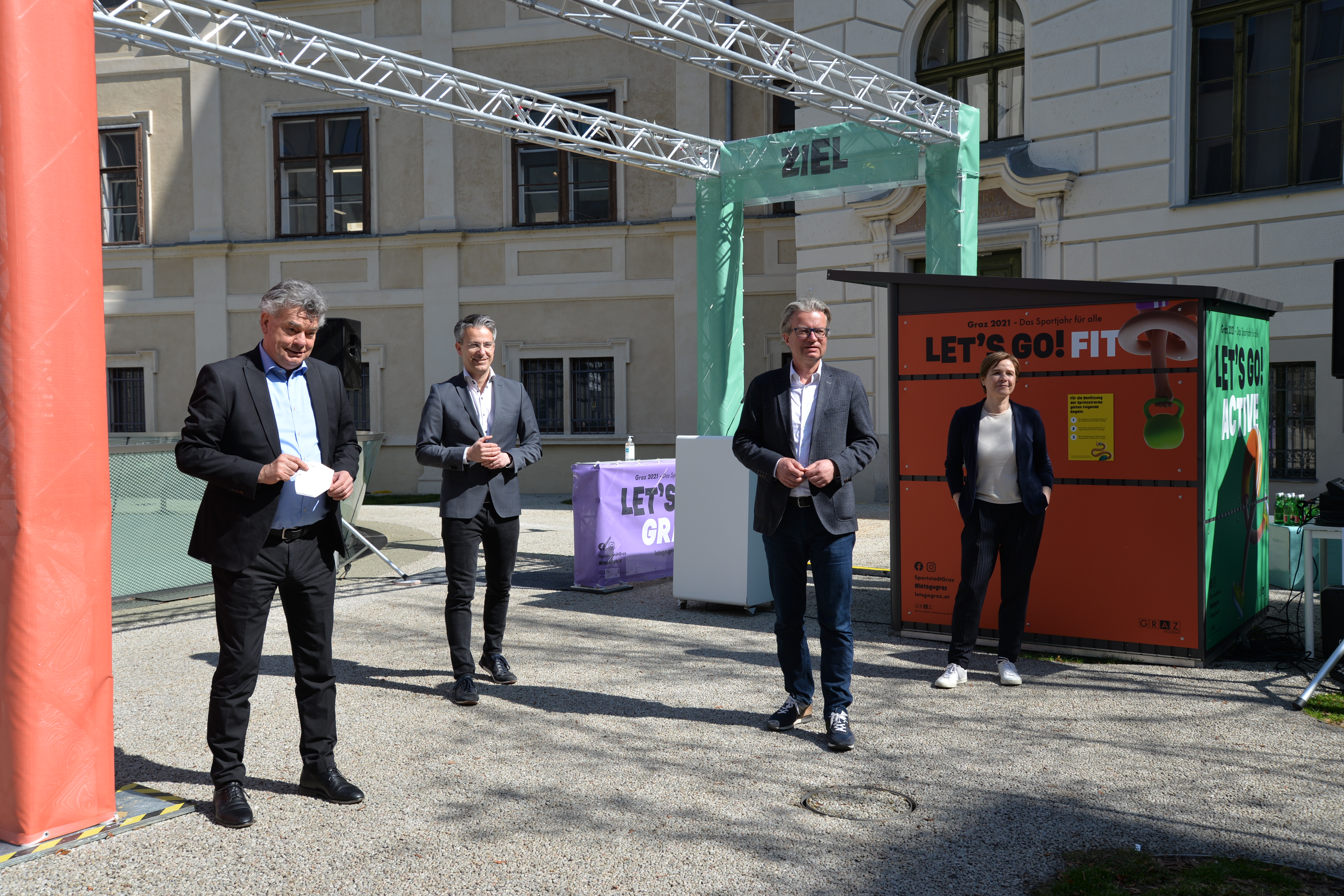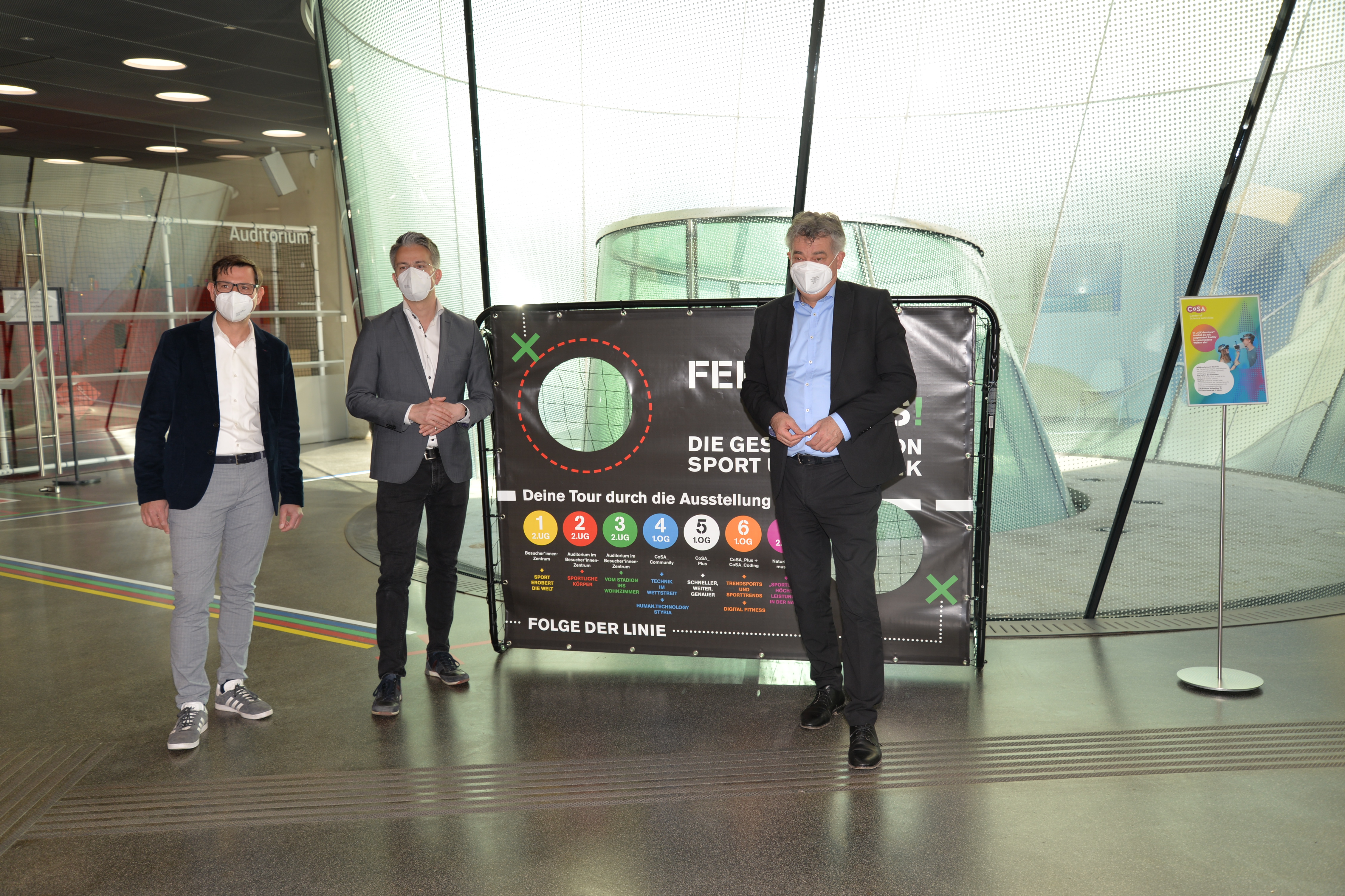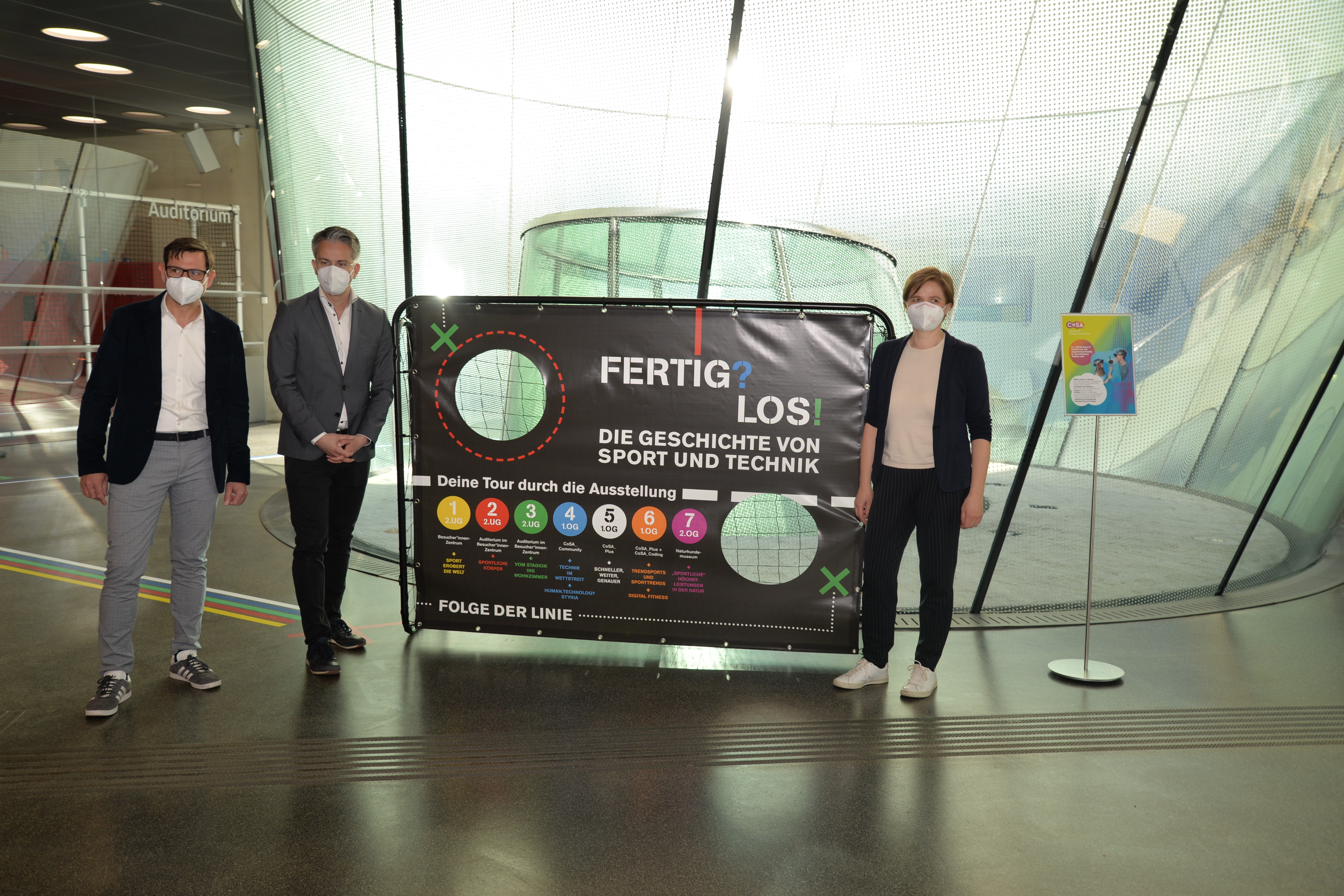 Die Ausstellung wurde heute, am 26. März 2021, von Vizekanzler und Minister für Kunst, Kultur, öffentlichen Dienst und Sport Werner Kogler, Kultur- und Sportlandesrat Christopher Drexler, Sportstadtrat Kurt Hohensinner und dem Geschäftsführer und Intendant des Frida & freD Kindermuseums Jörg Ehtreiber eröffnet. Auch Stadträtin Judith Schwentner nahm teil. „Die Sportausstellung Fertig? Los! im CoSA führt Kultur und Sport auf besondere Weise zusammen. In einer Zeit, in der leider auch im Sport noch viele Einschränkungen bestehen, ist es umso erfreulicher, dass in der Sportausstellung nicht nur Wissen und Informationen vermittelt werden, sondern Besucherinnen und Besucher auch auf vielseitige Art und Weise zur aktiven Bewegung eingeladen werden“, erklärt Landesrat Drexler. Auch Stadtrat Kurt Hohensinner zeigt sich begeistert: „Die Ausstellung zeigt eindrucksvoll die enge Verbundenheit der beiden Bereiche, von der technischen Entwicklung von Sportgeräten über Leistungs- und Zeitmessung bis hin zu Rundfunk und Sportübertragungen. Ganz nach dem Motto des Sportjahres lädt die Schau darüber hinaus ein, auch selbst aktiv zu werden.“ Vizekanzler Werner Kogler betont, wie wichtig die Möglichkeiten für Sport und kulturellen Genuss auch momentan sind: „Gerade in Zeiten großer Einschränkungen wird uns schmerzlich bewusst, dass zu einem erfüllten freudvollen Leben mehr gehört als nur die Deckung unserer Grundbedürfnisse. Soziale Interaktionen beispielsweise, kultureller Genuss wie etwa ein Ausstellungsbesuch, aber ganz besonders auch Sport, passiv wie aktiv.“