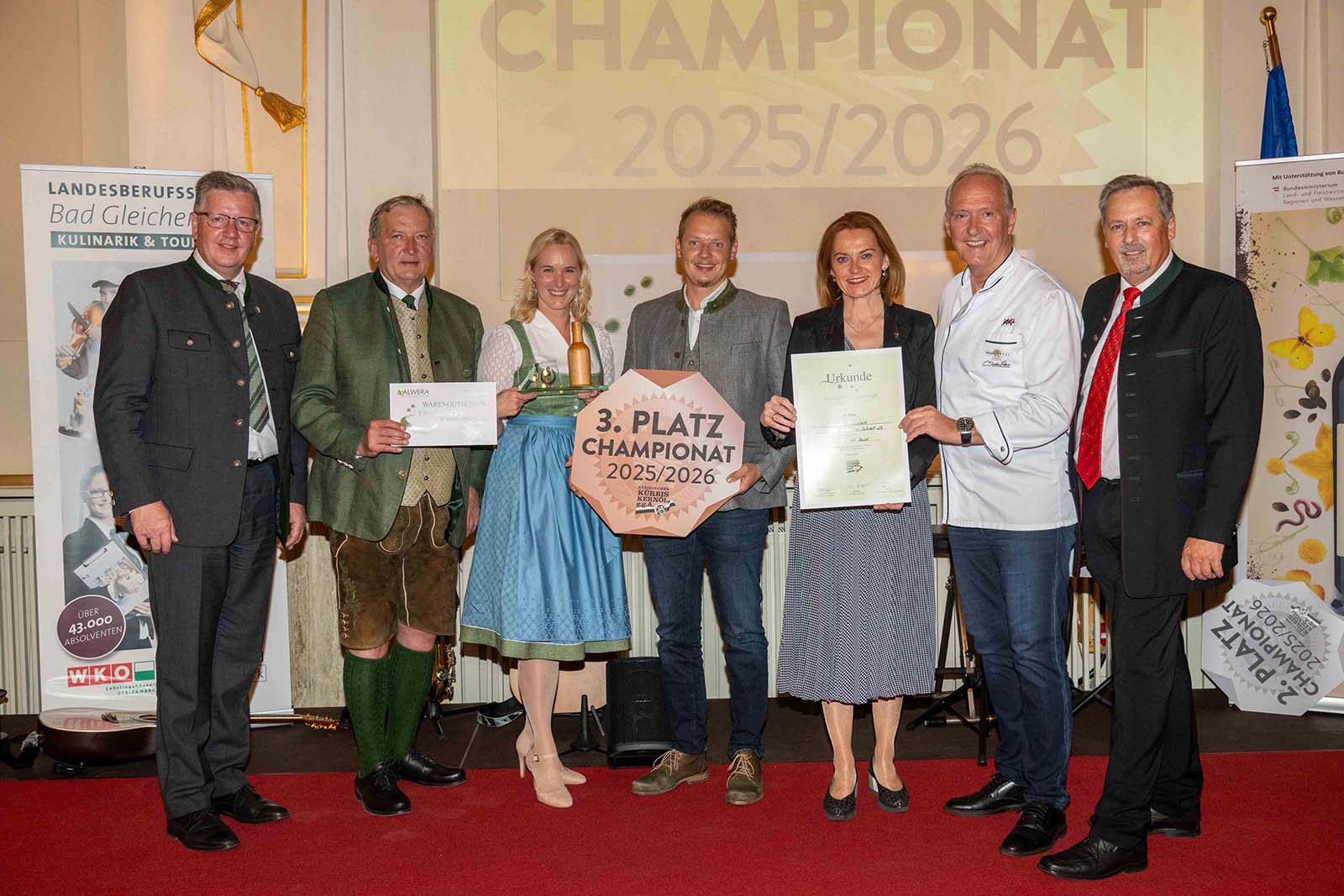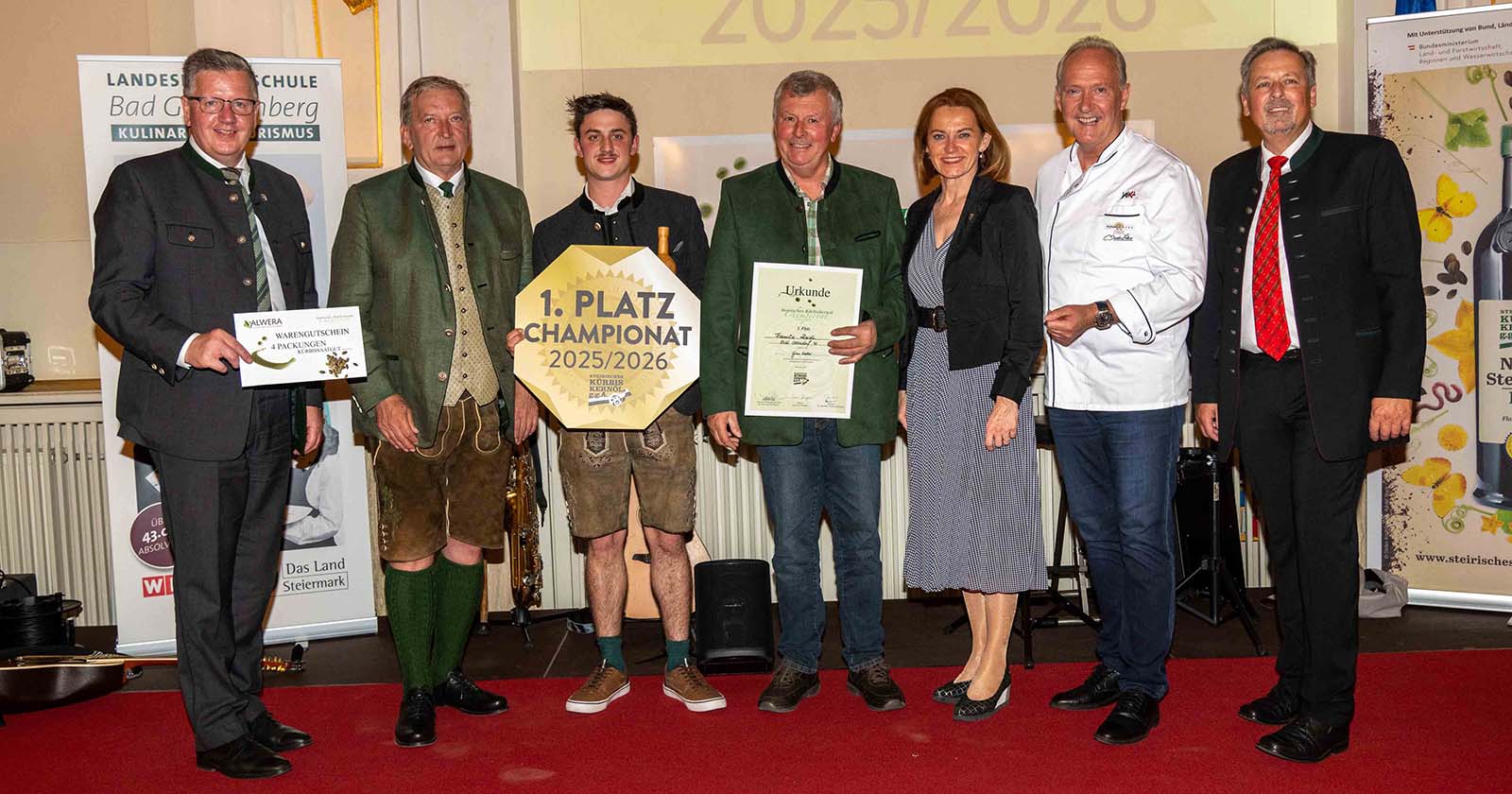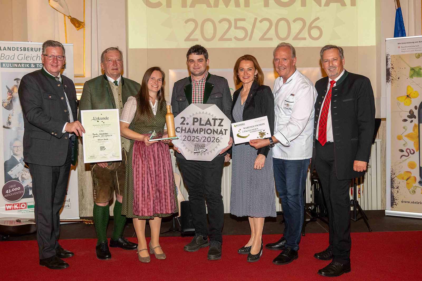 Mehr als 500 steirische Kürbiskernöle stellten sich der Bewertung einer 70-köpfigen Jury aus Spitzenköchen, Fachleuten und prominenten Persönlichkeiten. Bewertet wurde in der Landesberufsschule Bad Gleichenberg für Kulinarik und Tourismus. Nur die 20 besten Öle schafften es ins Finale – und schließlich auf das Siegerpodest. Landwirtschaftskammer-Präsident Andreas Steinegger und Landesrätin Simone Schmiedtbauer lobten die Ausgezeichneten: „Unsere Champions sind wahre Botschafter des steirischen Kürbiskernöls. Mit ihrem Wissen, ihrer Leidenschaft und ihrem Qualitätsbewusstsein tragen sie das grüne Gold der Steiermark weit über die Grenzen Österreichs hinaus.“;