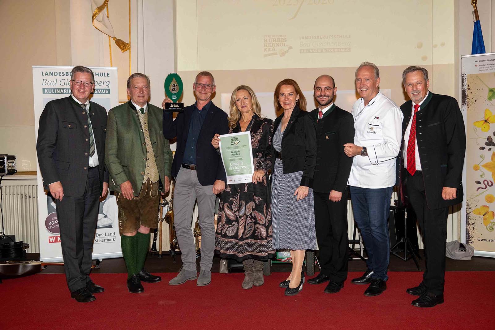 Zum fünften Mal wurde auch die „Ölmühle des Jahres“ ausgezeichnet – heuer ging der Titel an die Ölmühle Hartlieb aus Heimschuh. Platz 2 belegte die Ölmühle Schmuck aus Deutschlandsberg, Platz 3 die Ölmühle Pronnegg aus Saggau. Bewertet wurden Sorgfalt und Qualität bei Ernte, Trocknung, Lagerung und Pressung der Kerne