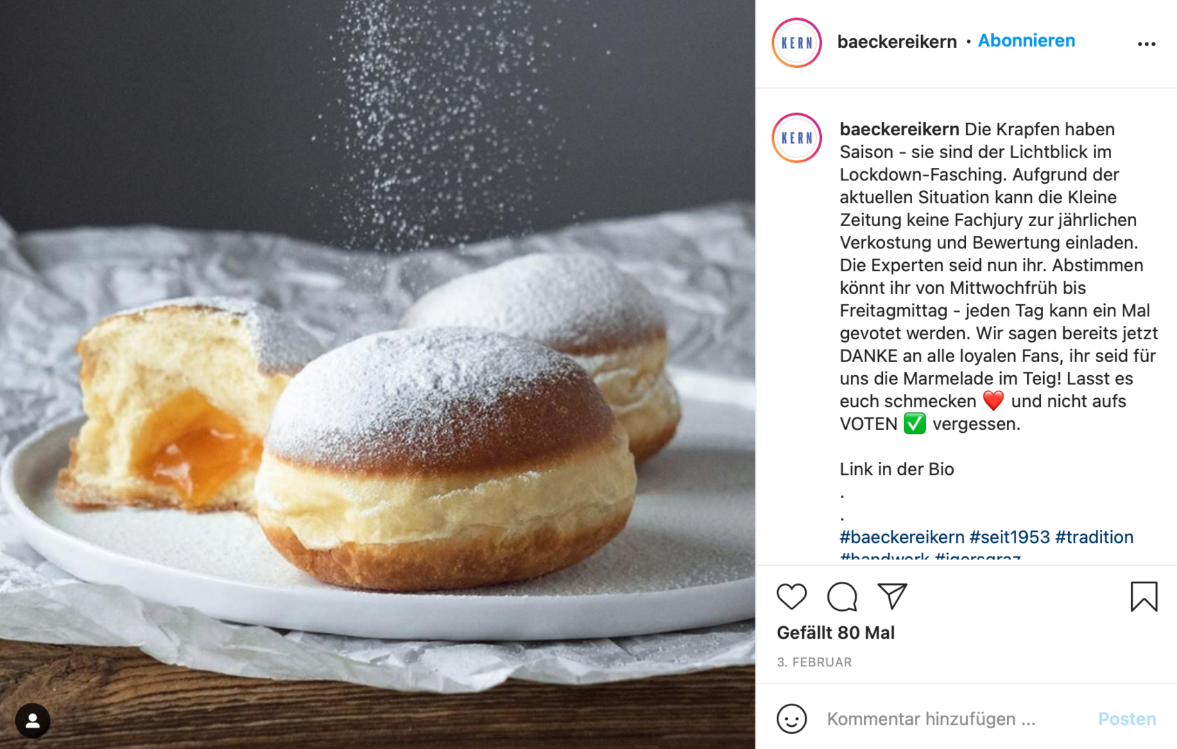 Ein absolutes Krapfen-Highlight bietet auch die Bäckerei Kern. Mit ausgezeichnetem Geschmack, perfekter Konsistenz und einem guten Verhältnis aus Teig und Marmelade überzeugen die Krapfen auch hier. Die Leckerbissen sind dazu auch noch richtig günstig