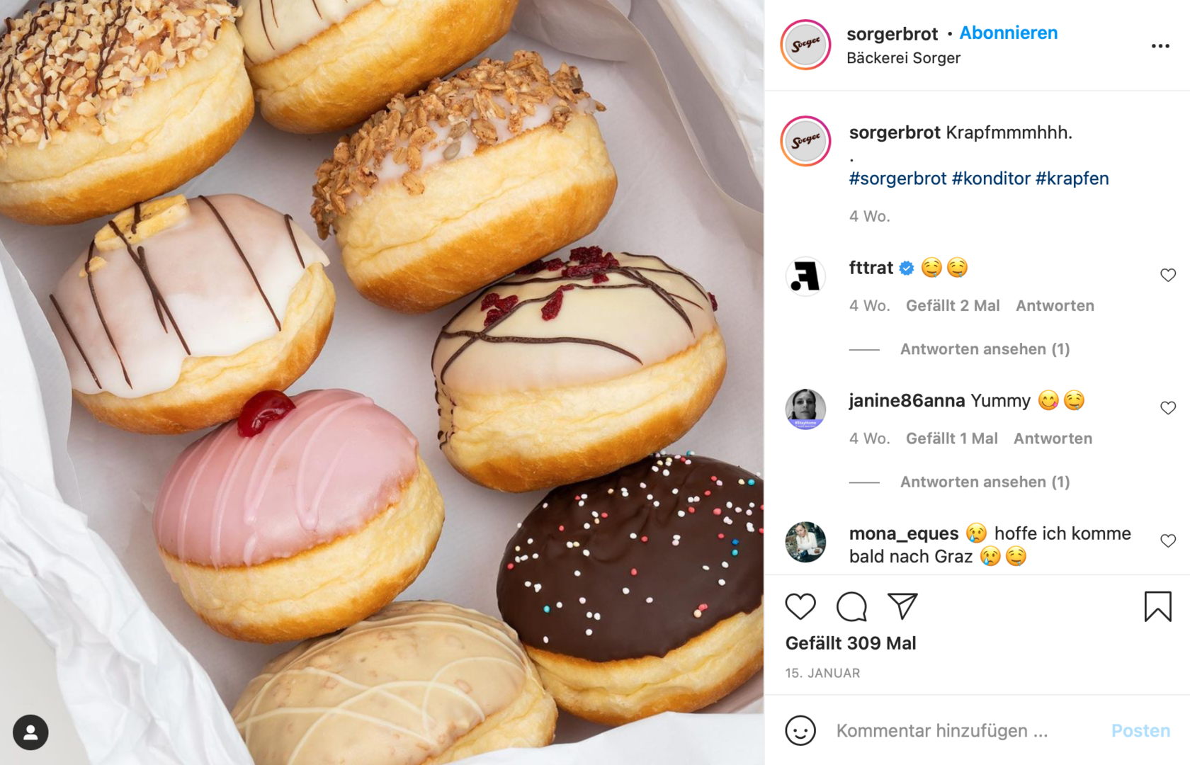 Wenn es nur um die Auswahl an unterschiedlichen Sorten ginge, dann wäre die Bäckerei Sorger schon eine Klasse für sich. Aber auch der traditionelle Marillekrapfen kann sich mehr als sehen bzw. essen lassen. Schöne Optik und köstlicher Geschmack sind beim Sorger garantiert.