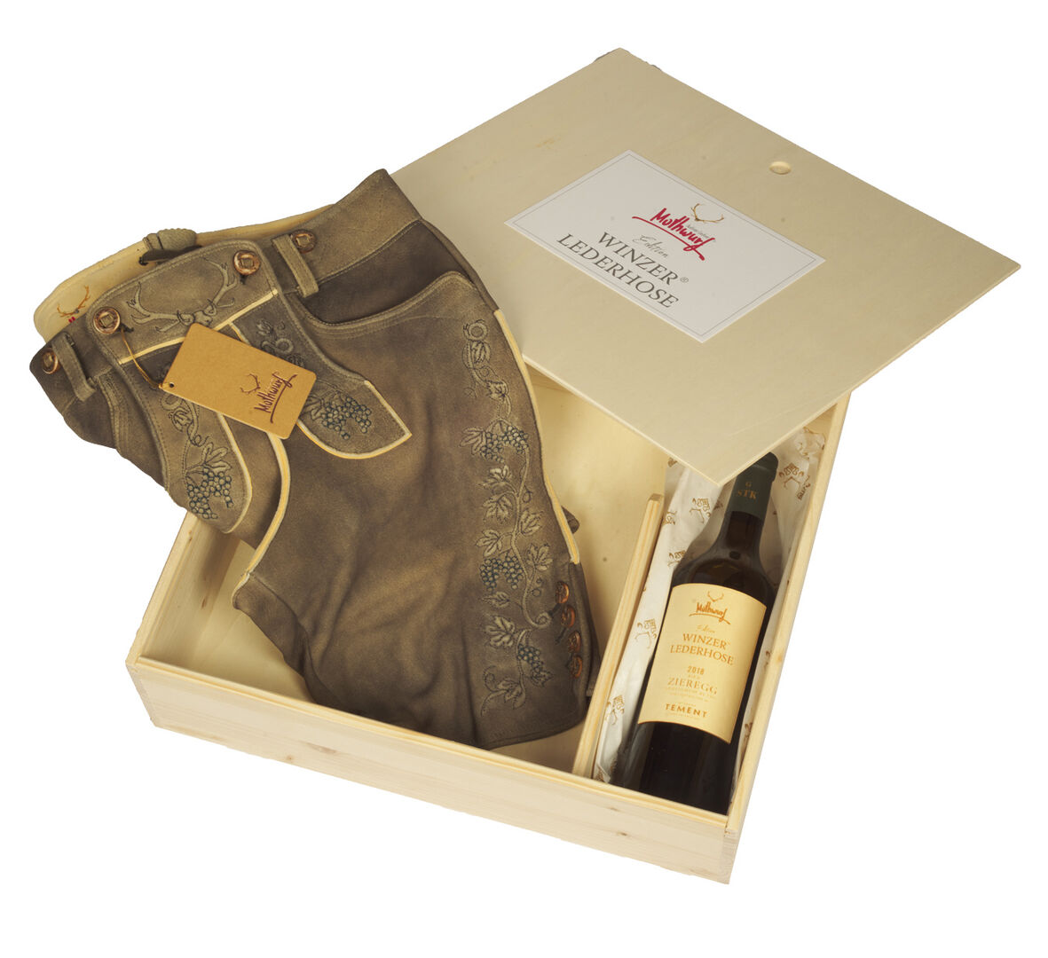 Als Kooperationspartner fungiert das südsteirische Weingut Tement. „Die zwei verschiedenen Modelle werden in einer hochwertigen, gebrandeten Holzkiste gemeinsam mit einer Magnum- bzw. 0,75-l-Flasche Tement Sauvignon blanc Zieregg 2018, unserer eigenen Sonderedition, und mit Lederetikett verkauft. Nicht nur die Winzer-Lederhosen®, auch die Weine sollen in den kommenden Jahren zu Liebhaber- und Sammlerobjekten werden", erklärt Helmut Schramke.