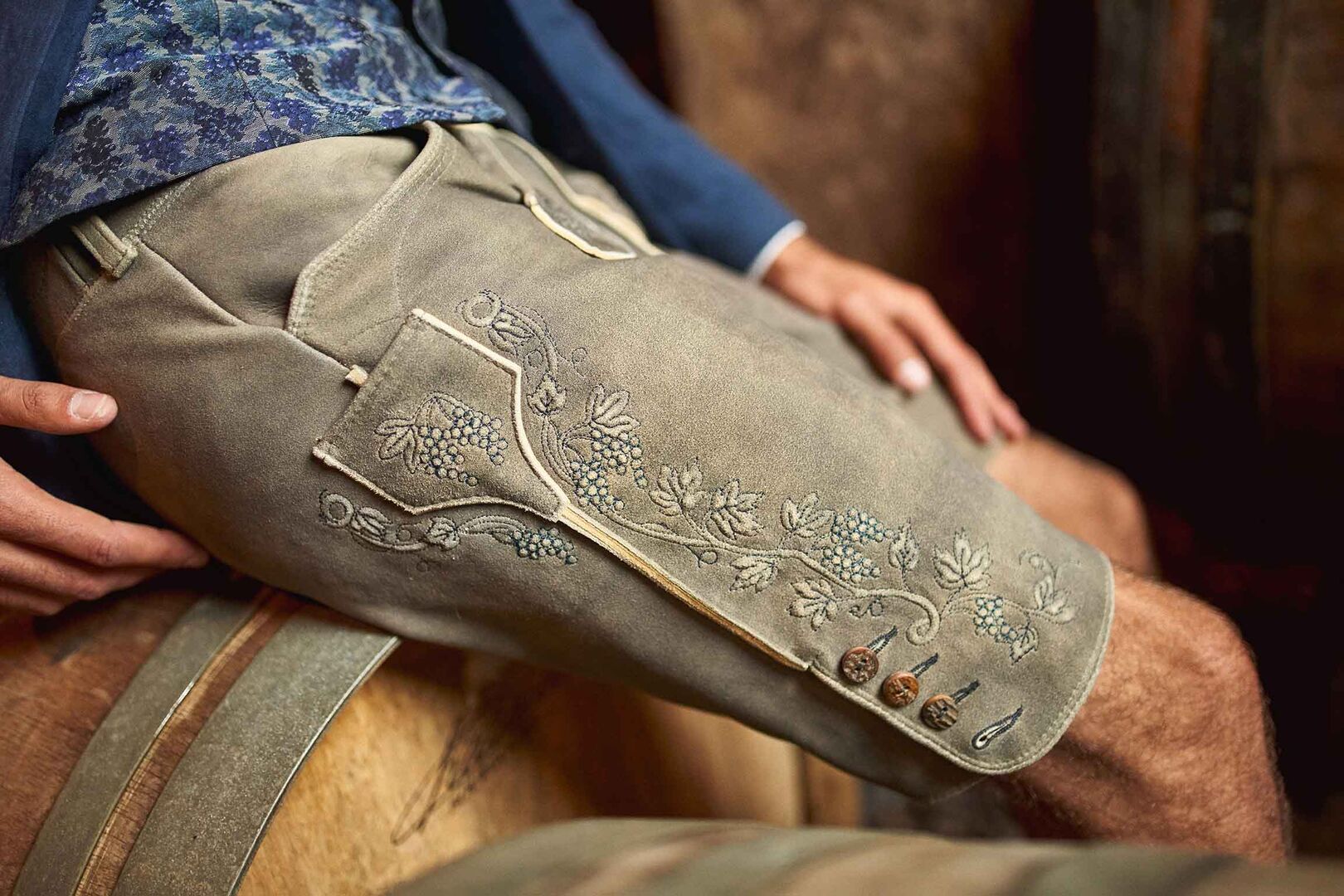 Die elegante und hochwertige Lederhose wird momentan in zwei Ausführungen vom Traditionshaus Meindl produziert: in braunem Hirschleder und grauem Ziegenleder. Weitere Modelle sind in Planung. Passend zum Thema sind beide Ausführungen mit Weintrauben und -ranken bestickt und außerdem perfekt kombinierbar mit den stilvollen Mothwurf-Gilets und -Jacken für Männer.