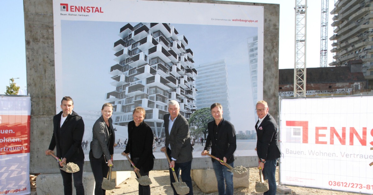 Der von der Wohnbaugruppe ENNSTAL errichtete Green Tower ragt nun innerhalb des neuen Stadtviertels Reininghaus in seiner gesamten Größe in den Himmel. Im Zuge der Gleichenfeier, zu der Vorstand Wolfram Sacherer am Dienstag lud, erhielt er auch seine erste Begrünung. Der Green Tower soll in puncto Nachhaltigkeit und Ressourcenschonung als Leuchtturmprojekt dienen. „Der Green Tower ist ein besonders innovatives Beispiel – durch sein durchdachtes und einzigartiges Grünraumkonzept bindet er rund 10.000 kg CO2 jährlich. Die Bepflanzung der breiten Balkone dient zudem als natürlicher Lebensraum und begünstigt damit die Artenvielfalt“, betont Sacherer, der sich über diesen Meilenstein auf dem Weg zur Fertigstellung dieses ganz besonderen Projekts freut.