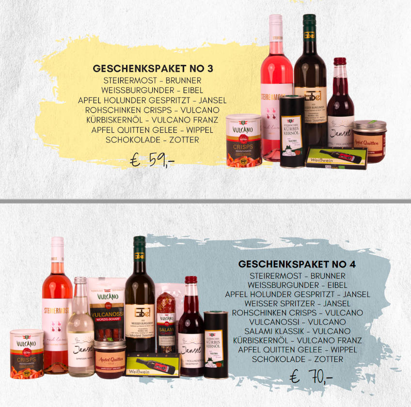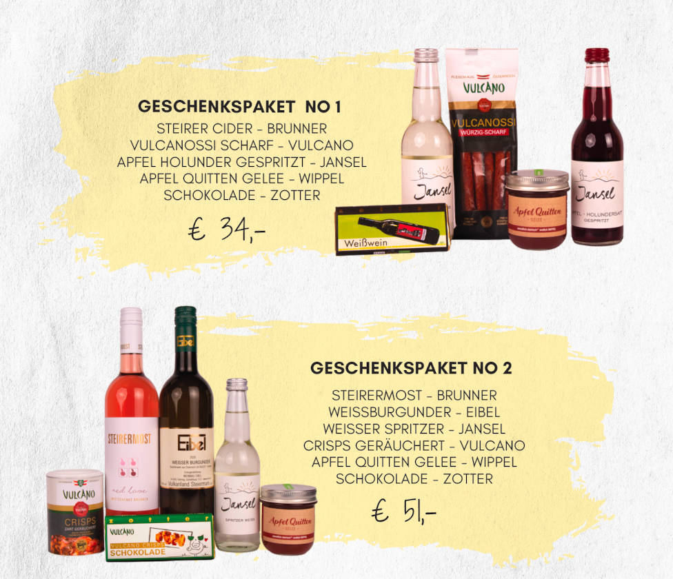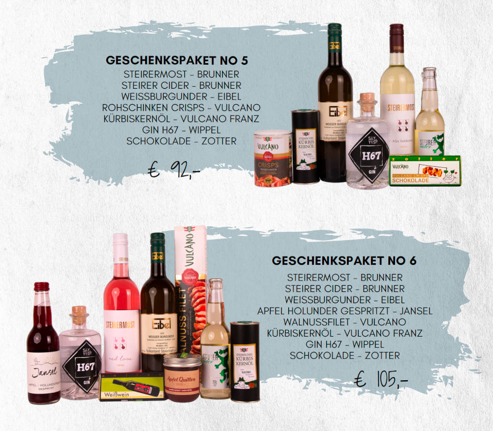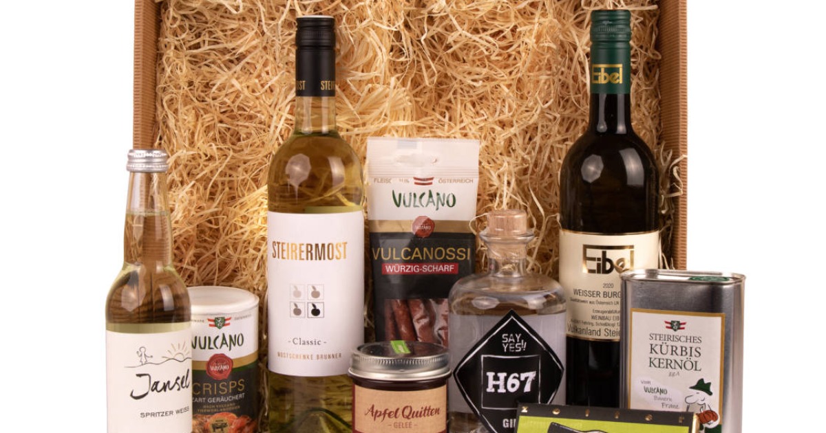 Die Schmankerl in den Paketen stammen ausschließlich von Betrieben der Lions Club Veste Riegersburg Mitglieder aus der Südoststeiermark. Ob Most von der Mostschenke Brunner, Wein von Weinbau Eibel, Säfte von Wilhelm Jansel oder Gin von Wippels Hofbergstuben – in den Paketen vereinen sich die feinsten Tropfen der Region. Ergänzt mit Delikatessen aus der Vulcano Schinkenmanufaktur und Zotter Schokoladen wird das Paket zum wahren Genusserlebnis.