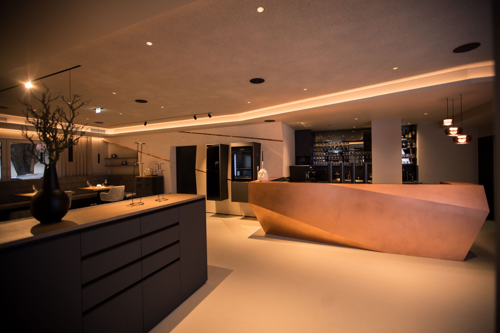 Im neuen Design spielt auch Kupfer eine zentrale Rolle: Das originale, 40 Jahre alte Kupferdachl wurde abgetragen und als Barverkleidung neu interpretiert. Auch sonst zieht sich das Thema Kupfer durch das gesamte Interieur: handgeschmiedetes Besteck aus Irland, eine eigens entwickelte Spachteltechnik an den Wänden und Kunstwerke von Carola Deutsch schaffen eine einzigartige Atmosphäre. Ergänzt wird das edle Ambiente durch einen begehbaren Weinschrank mit über 300 Positionen, einen Dry Ager im Gastraum und umfassende Barrierefreiheit.