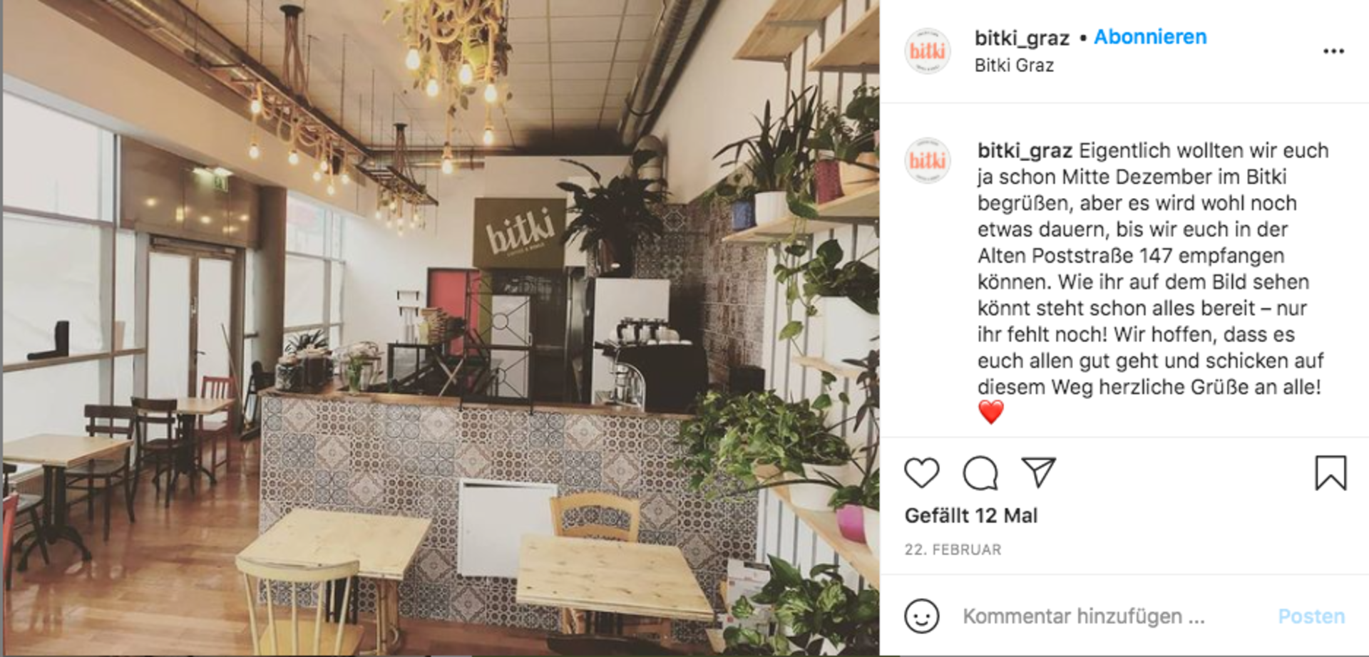 „Bitki“ ist Türkisch und bedeutet übersetzt so viel wie Pflanze – und genau die steht im Lokal im Vordergrund. „Wir verwenden nur qualitativ hochwertige Produkte, kein Plastik oder Alufolie, sondern nur biologische Verpackungen“, erklärt Betreiber Seyfullah Bicen. Viele grüne Pflanzen schaffen auch im Inneren des Lokals eine gemütliche Atmosphäre. Neben den orientalischen Bowls mit Couscous, Reis, Linsen und Hummus stehen auch Kebaps mit hochwertigem Fleisch und Wraps auf der Speisekarte. Frischen „Paul&Bohne"-Kaffee kann man sich dort ebenfalls holen. Bis zur Öffnung der Gastronomie sind die Köstlichkeiten im „Bitki“ über Velofood oder Selbstabholung verfügbar.