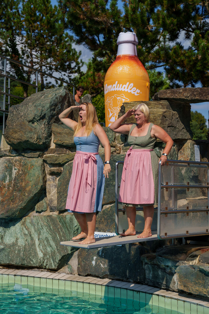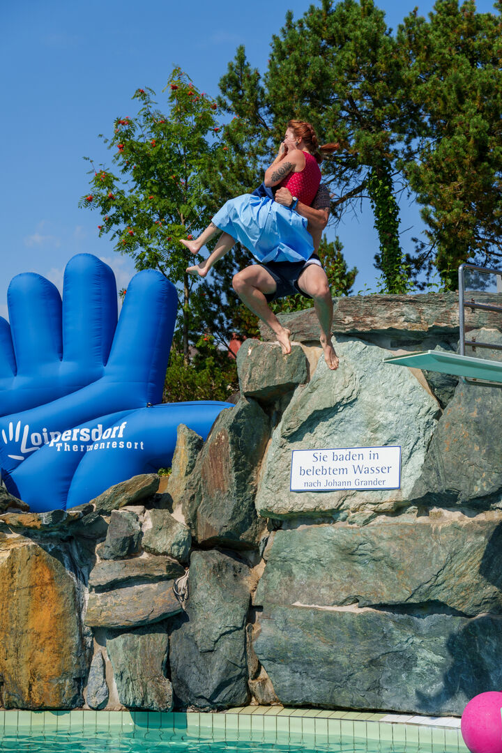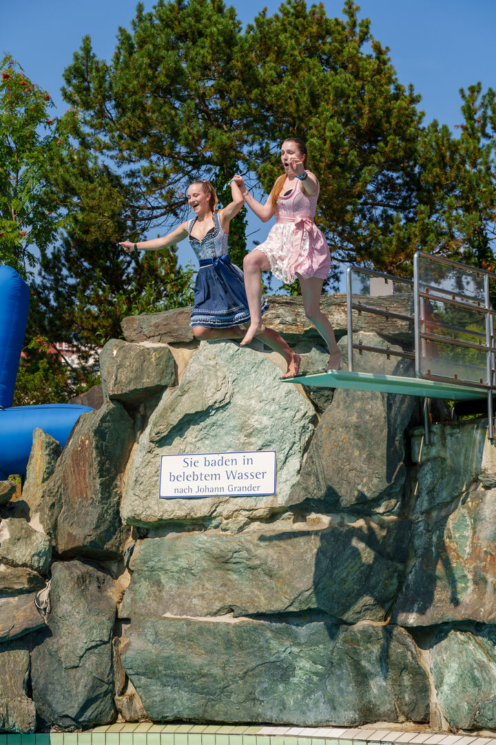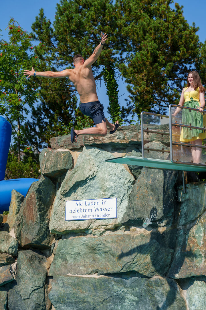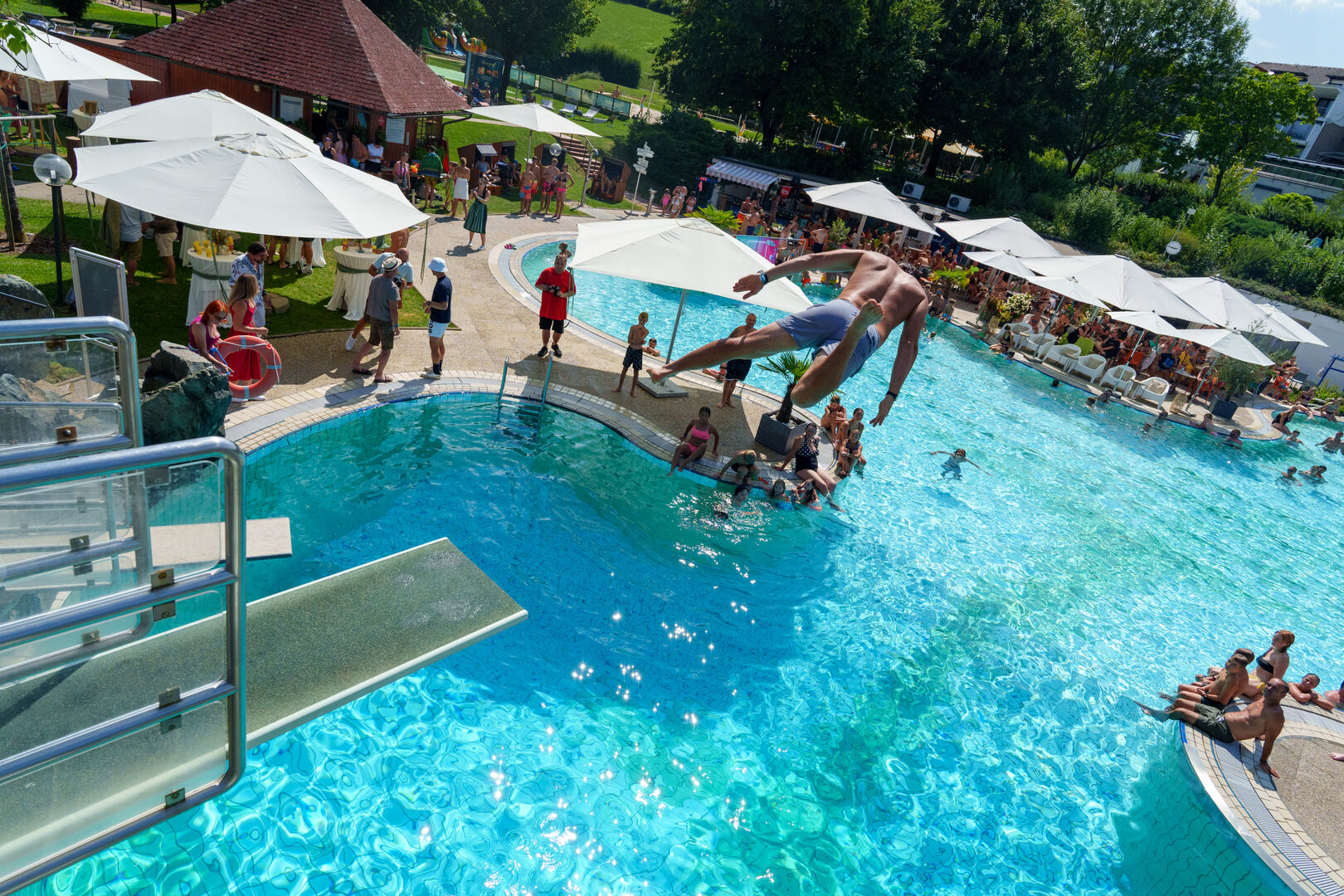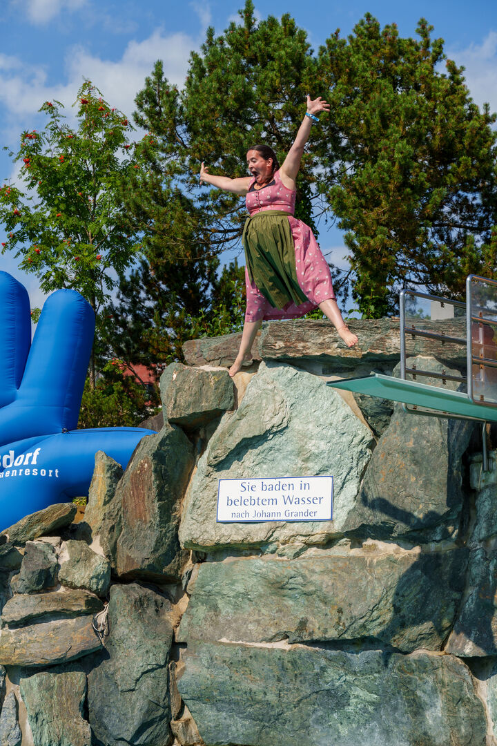 Die von Trachtenmoden Hiebaum ausgestatteten Teilnehmer sprangen ums Vergnügen. Mitmachen konnte jeder, der sich vorab zum Event angemeldet hatte. Eine Sprungperformance der besonderen Art bot Drag Queen Tamara Mascara: Sie überraschte alle, in dem sie als Frau ins Wasser sprang und als Mann wieder auftauchte. Im Finale traten die Teams im Doppelreifen-Rutschen und beim Wettpaddeln gegeneinander an – eine Party der Extraklasse!
