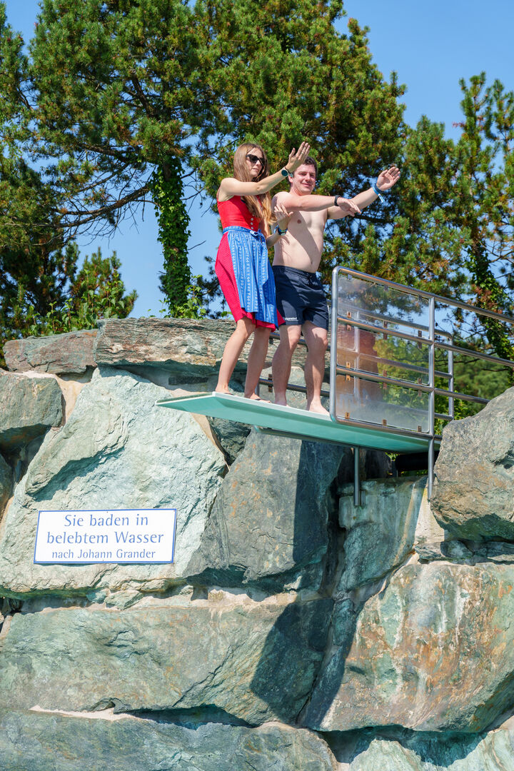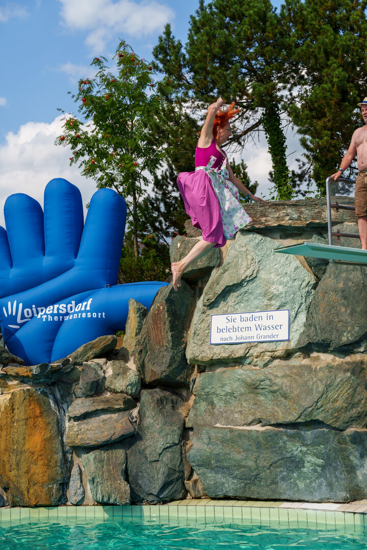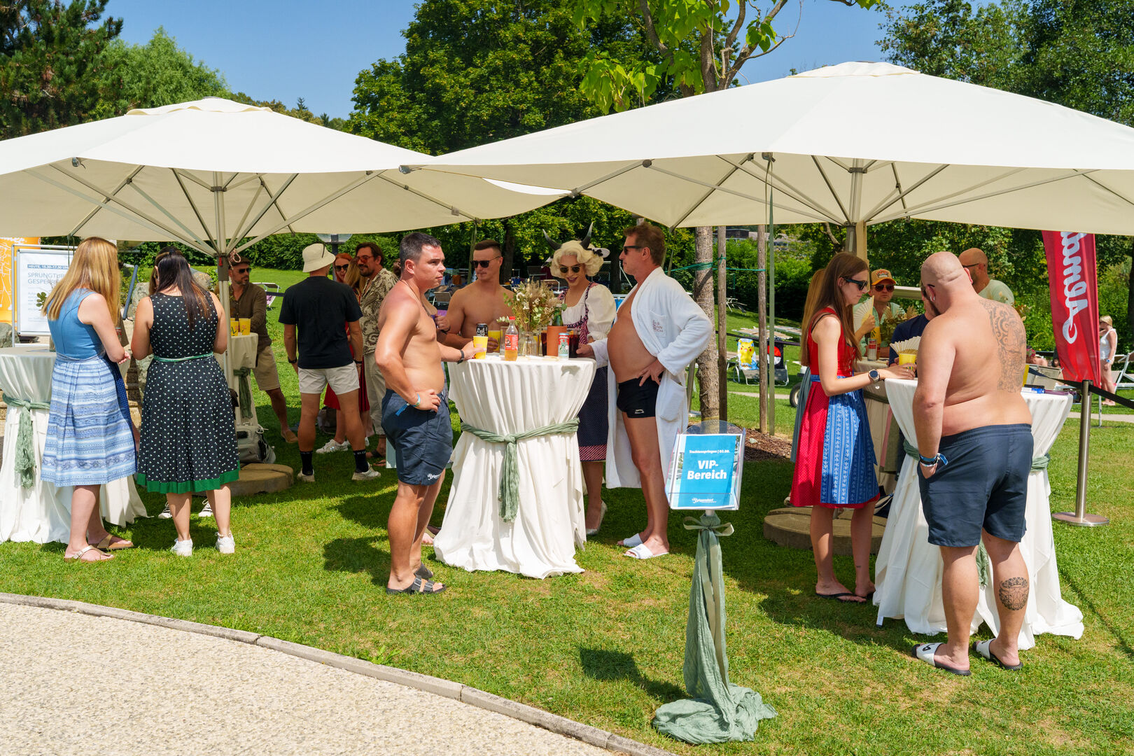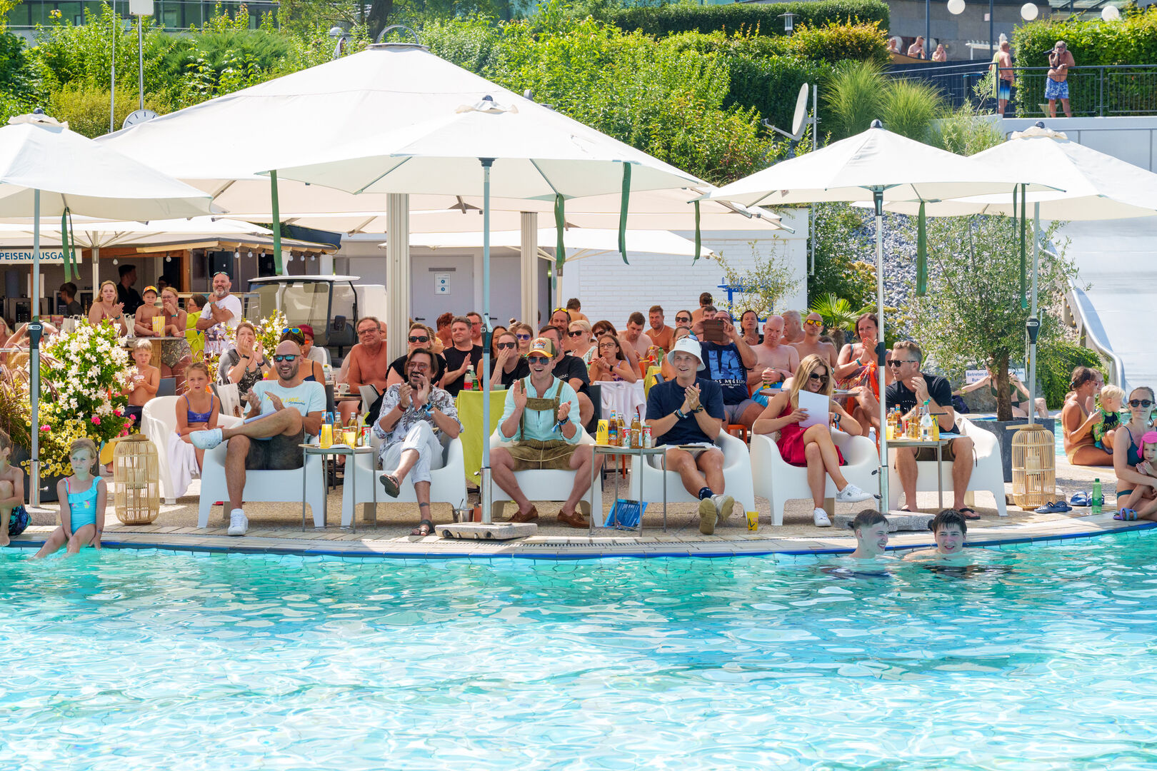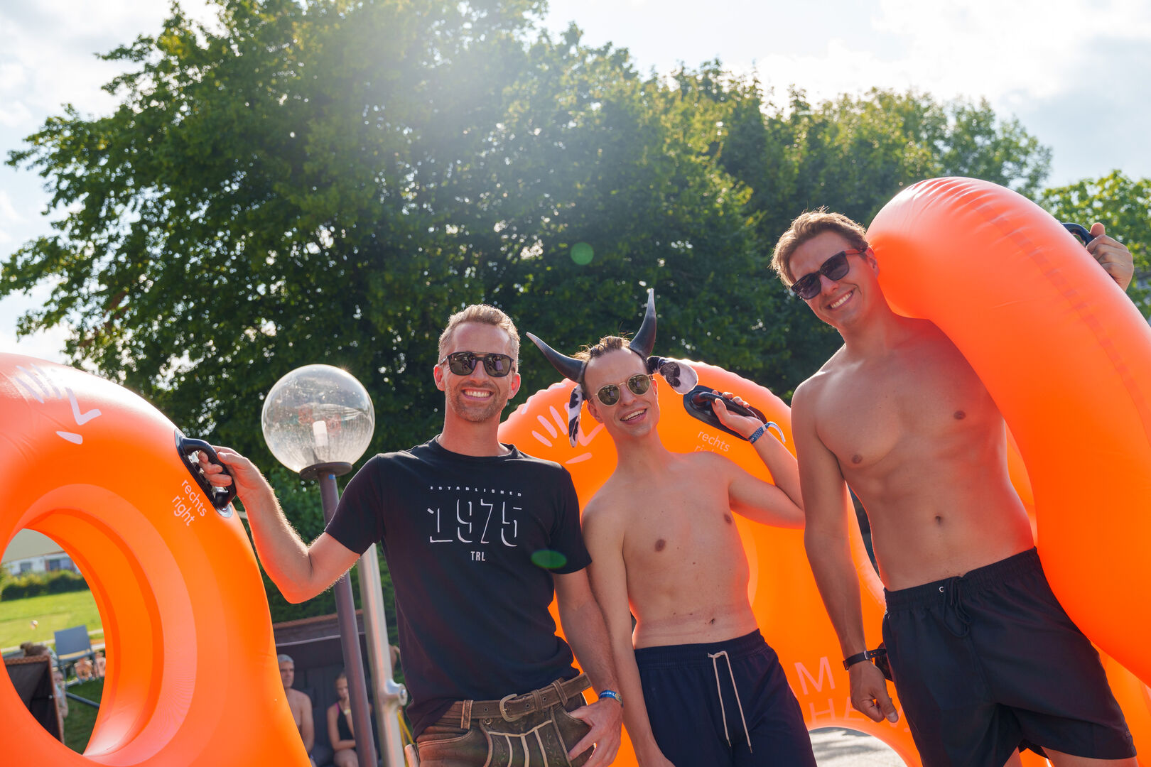 Die von Trachtenmoden Hiebaum ausgestatteten Teilnehmer sprangen ums Vergnügen. Mitmachen konnte jeder, der sich vorab zum Event angemeldet hatte. Eine Sprungperformance der besonderen Art bot Drag Queen Tamara Mascara: Sie überraschte alle, in dem sie als Frau ins Wasser sprang und als Mann wieder auftauchte. Im Finale traten die Teams im Doppelreifen-Rutschen und beim Wettpaddeln gegeneinander an – eine Party der Extraklasse!