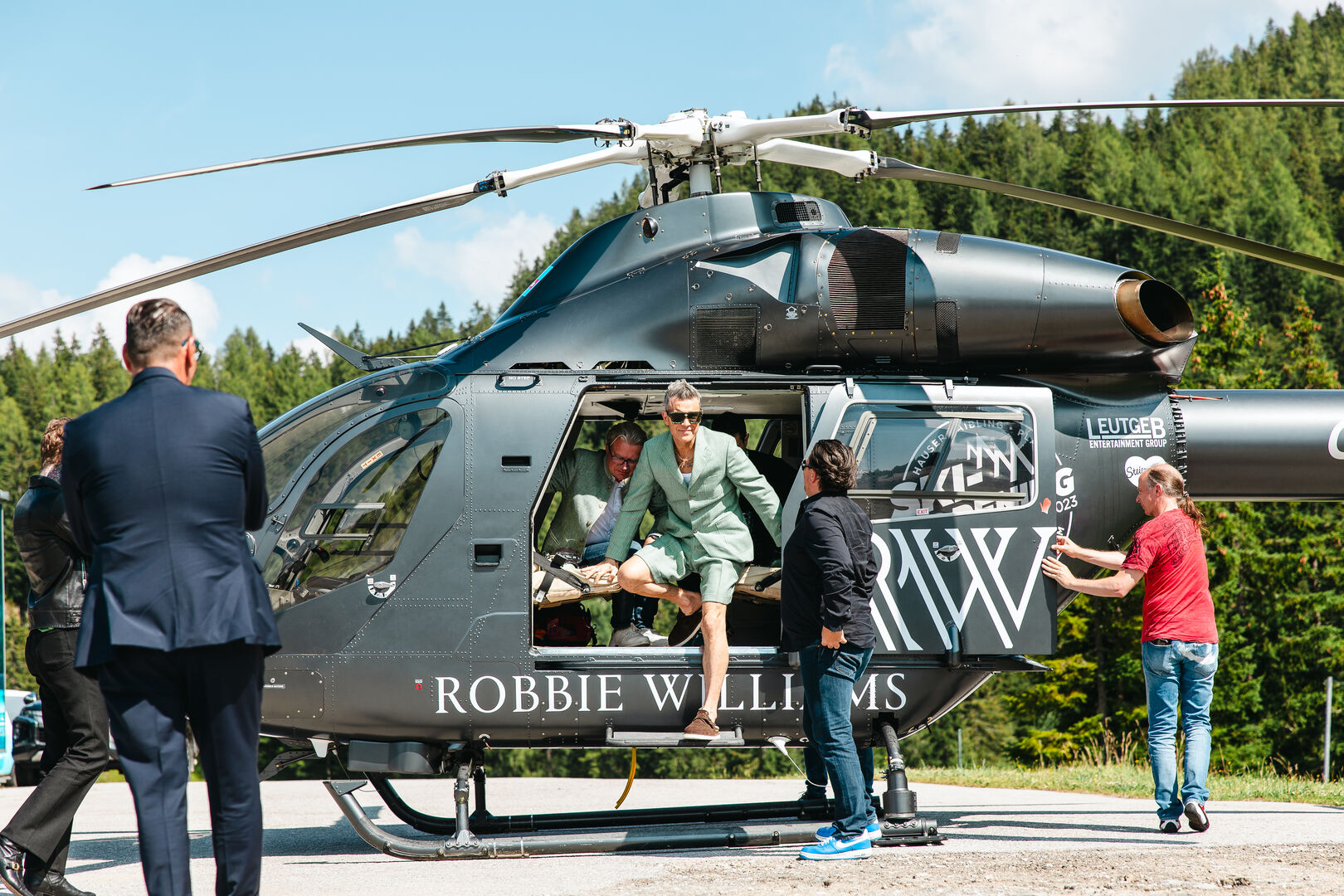 Ein spektakulärer Auftritt wird nicht nur bei den beiden Konzerten im Dezember erwartet, imposant war auch die Ankunft von Robbie Williams via Helikopter auf der Reiteralm im Rahmen der Pressekonferenz. Gemeinsam mit Landeshauptmann Christopher Drexler wurde der Entertainer direkt aus Klagenfurt eingeflogen und von Veranstalter Klaus Leutgeb, Schladming-Dachstein Gesch.ftsführer Mathias Schattleitner und den Geschäftsführern der Schladminger 4-Berge-Skischaukel vor wunderbarer Dachstein-Kulisse empfangen. Die Hauptakteure nahmen anschließend gemeinsam mit Moderator Benny Hörtnagl am Podium Platz. Ein hochkarätiges Aufgebot an Persönlichkeiten, eine spektakuläre Kulisse, eine durch und durch gelungene Vorankündigung!