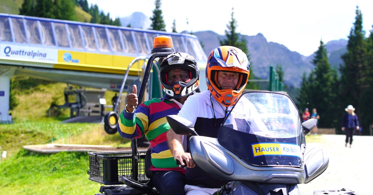 „Andere fahren hier rasant runter, ich mache es umgekehrt“, meint Roberto Blanco über seinen aufregenden Trip mit dem Quad, zu dem er von Seilbahnen-Geschäftsführer Klaus Hofstätter eingeladen wurde.
