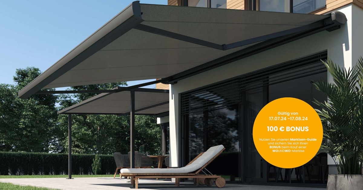 Tipp: Mit dem Markisen-Guide können Sie Ihre Markise genau nach Ihren Vorstellungen gestalten und anpassen. Exklusiv vom 17.07.2024 bis 17.08.2024 erhalten Sie €100-Bonus bei Anfragen über den WOUNDWO Markisen-Guide!