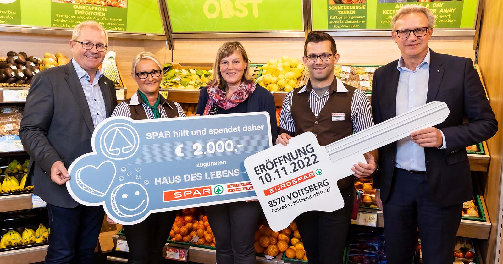 Der nagelneue Markt ist nicht nur optisch eine Augenweide, sondern wurde auch ressourcenschonend gebaut und mit energiesparender Technik ausgestattet. Auf fast 1.100 m² sind feine Lebensmittel, beginnend mit dem lichtgefluteten Frische-Marktplatz, sowie ein Sortiment an nützlichen Non-Food-Produkten platziert. Die Wiedersehensfreude ist dem EUROSPAR-Team rund um Marktleiter Klaus Schlack anzusehen. Im Rahmen der Wiederöffnung spendete SPAR € 2.000 an das „Haus des Lebens – LUII“ Voitsberg.