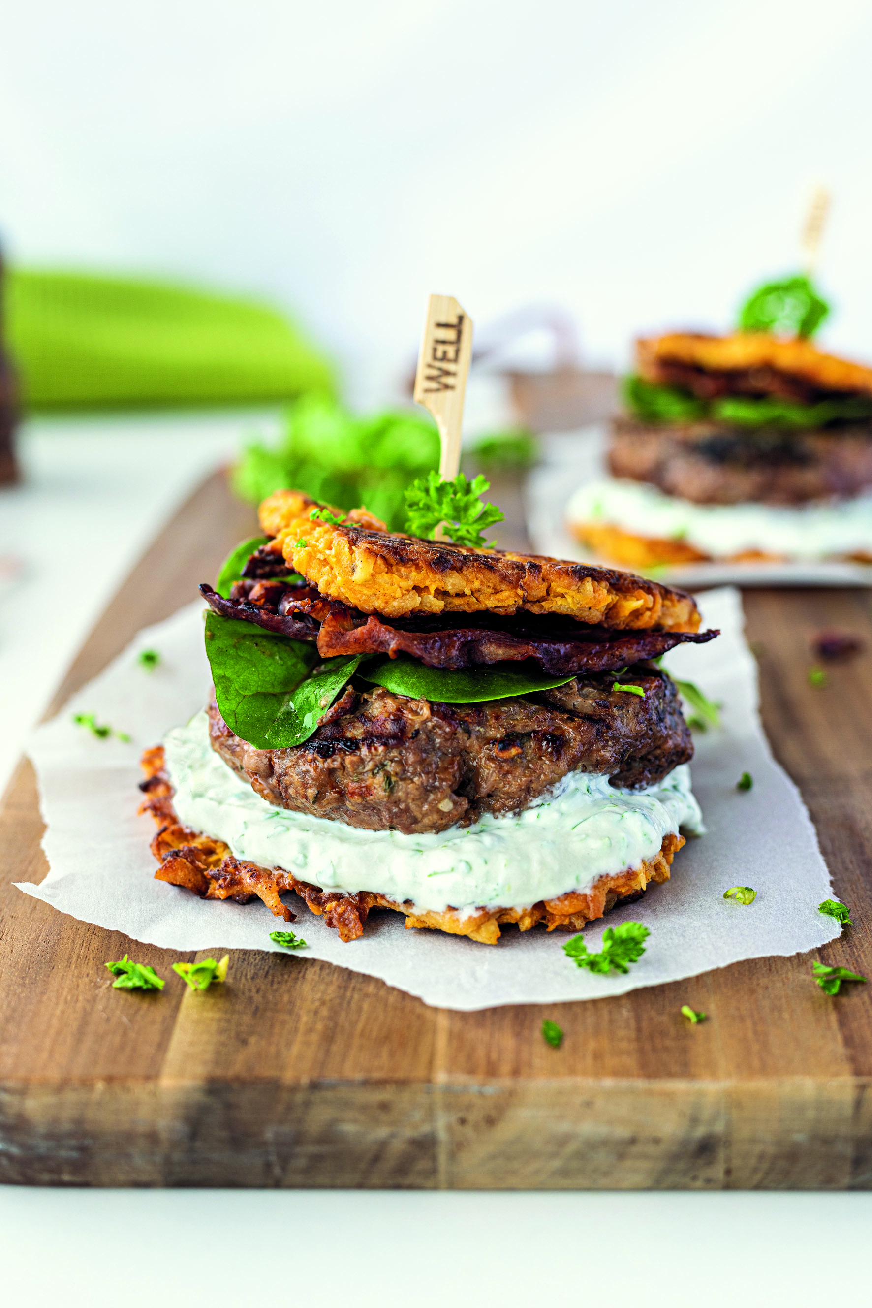 Sobald alle Komponenten fertig gegrillt sind, kannst du den Burger anrichten. Beginnn Sie mit einem Rösti, bestreichn Sie diesen mit etwas Kräutertopfen, legen Sie ein Beef Patty darauf und garnieren dieses mit knusprigem Speck und Salat. Den Burger mit einem weiteren Rösti finalisieren.