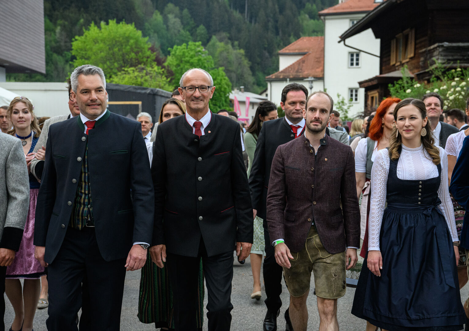 Bundeskanzler Karl Nehammer, LH Anton Mattle, Staatssekretär Florian Tursky und Staatssekretärin Staatssekretärin Claudia Plakolm.