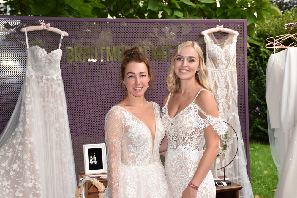 Cathrine im klassischen Hochzeitskleid, Raphaela im Vintage-Boho-Style von Braut- und Abendkleiderausstatter Mitzi aus Kempten.