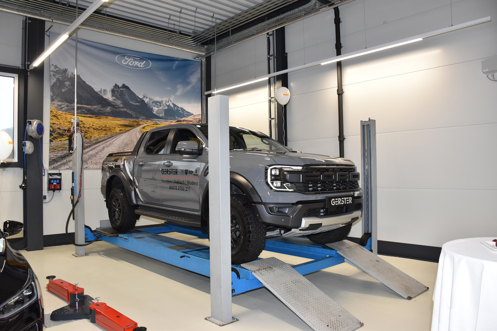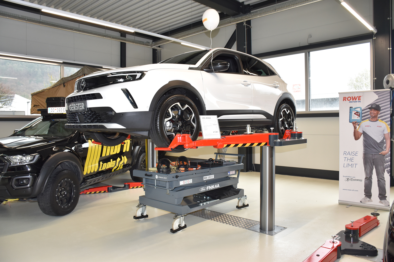 In der modernst eingerichtete Werkstatt sind 7 Hebebühnen, die Schwerlastbühne für Nutzfahrzeuge und PKW, spezielle Hebetechnik für Elektrofahrzeuge, eine 3D Achsvermessung und Räderhotel nur einige der neuen Features.