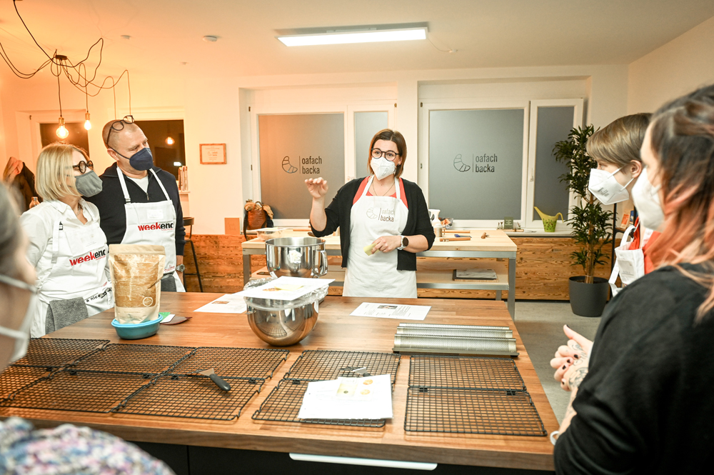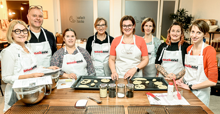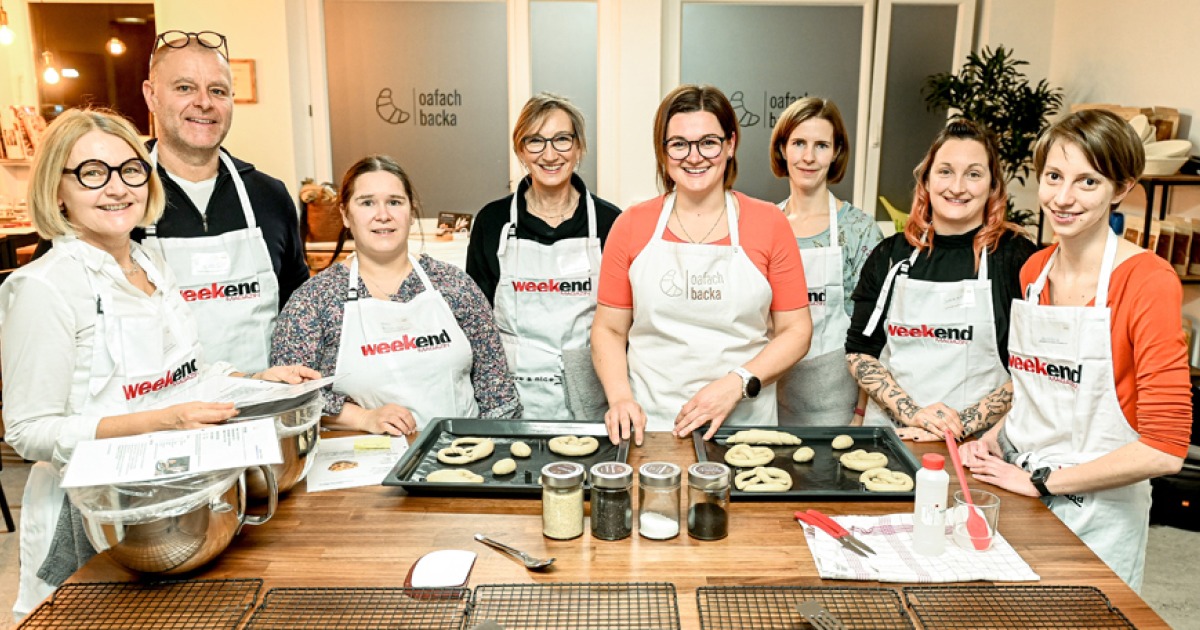Die liebevolle Vorbereitung zum Kurs durch Julia Bachmann war profimäßig, so konnte in kürzester Zeit jeder sechs unterschiedliche köstliche Kleingebäcksorten nach 3 1/2 Stunden im Stoffsack nach Hause nehmen. Der lustige Backabend war gespickt mit lehrreichen Infos zu Backwerkzeug, Brotbackprodukte und Insidertipps. TOP: Super Stimmung in der Gruppe durch Julias Begeisterung, ihre Rezepte und ihr Motto „Backen ist keine Hexerei - es ist oafach“.