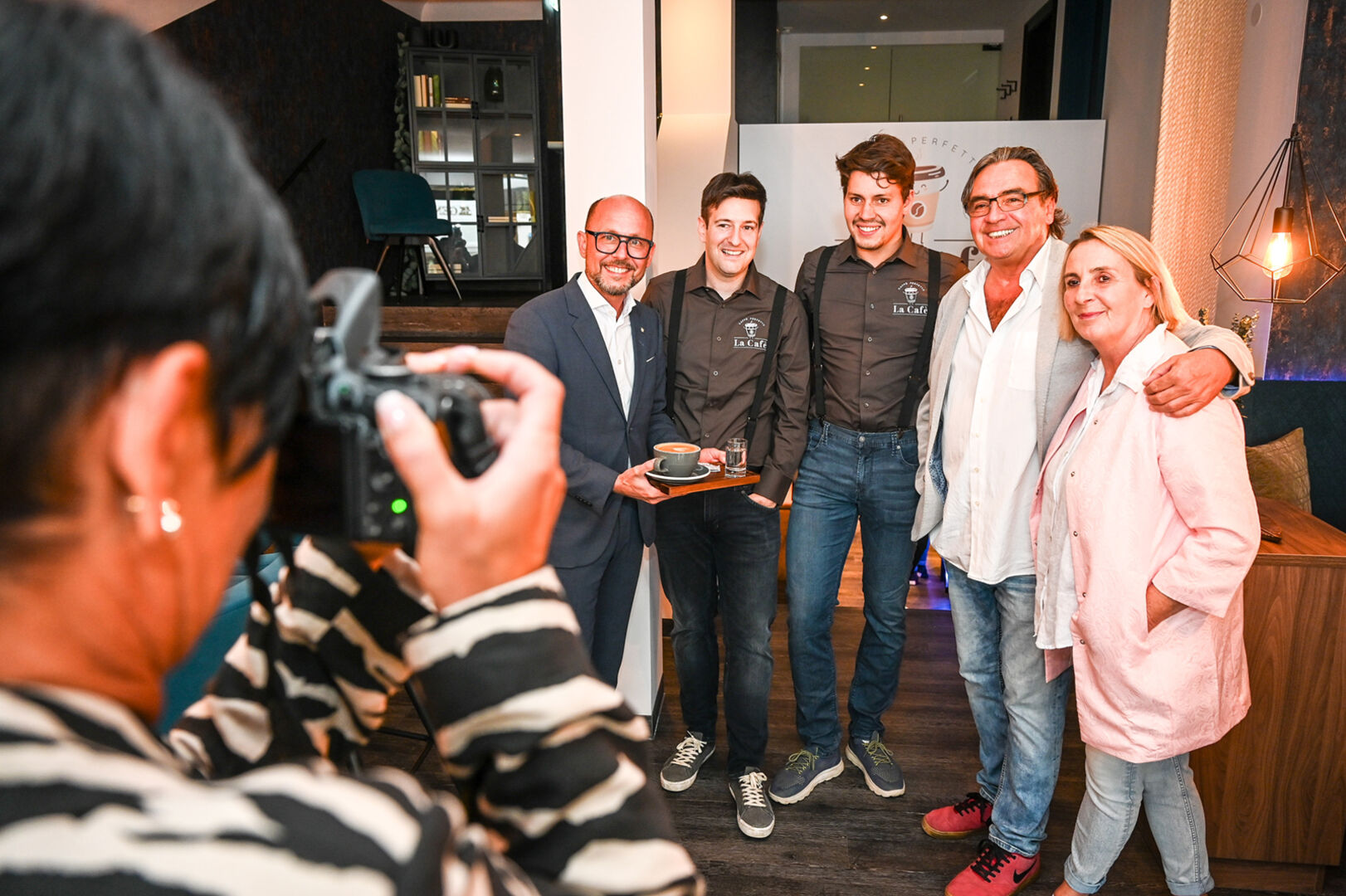 La Cafè-GF Manuel Vetter mit Bregenz Bürgermeister Michael Ritsch, Hausherr Werner Brugger mit Veronika sowie La Cafè-GF Claudio Errico