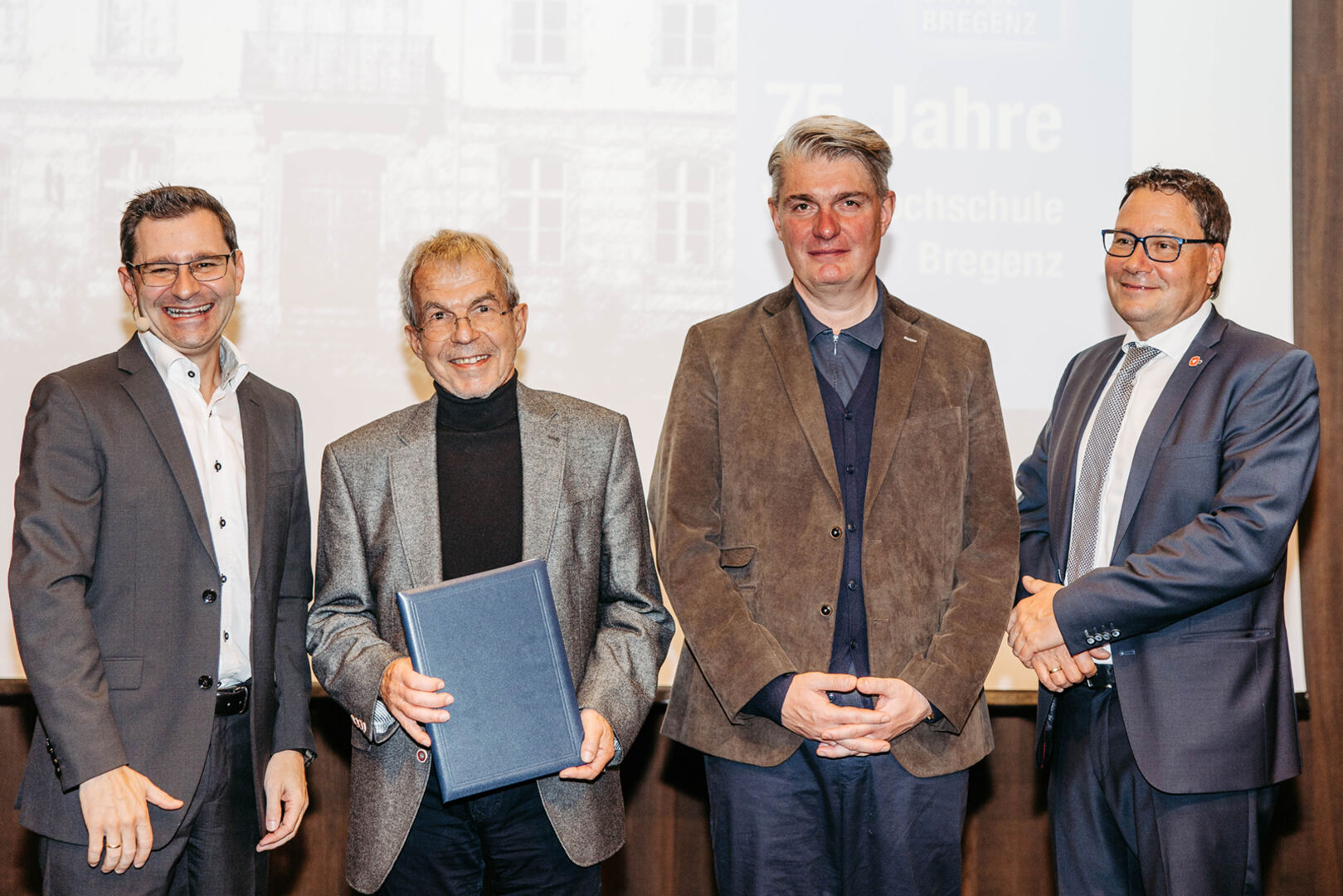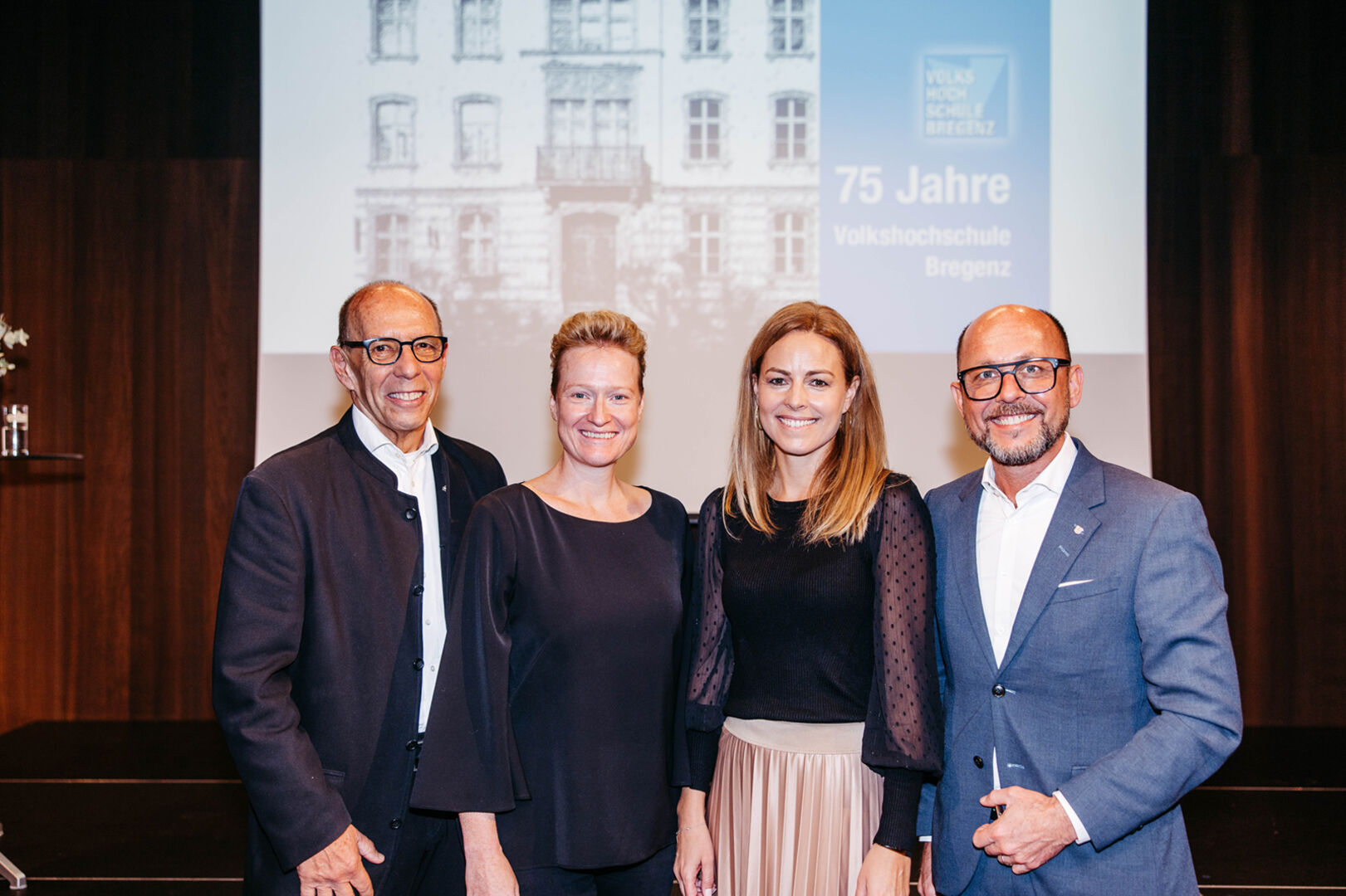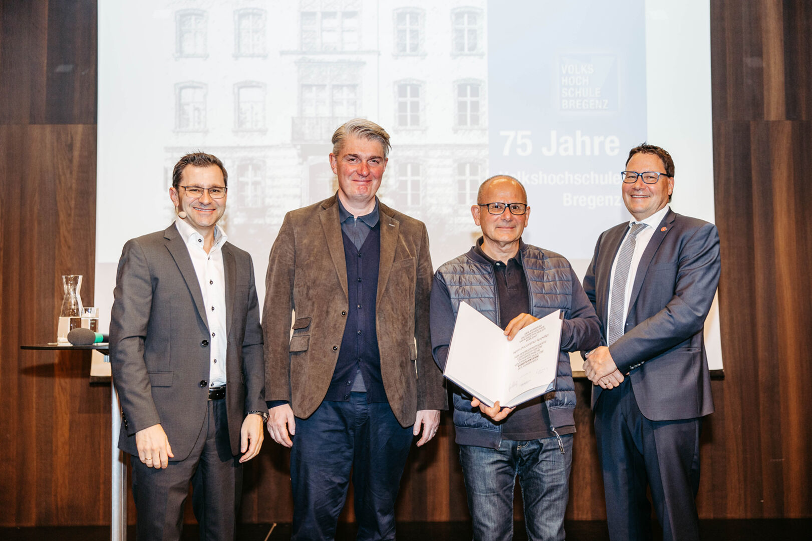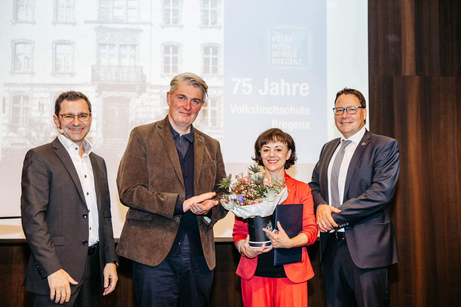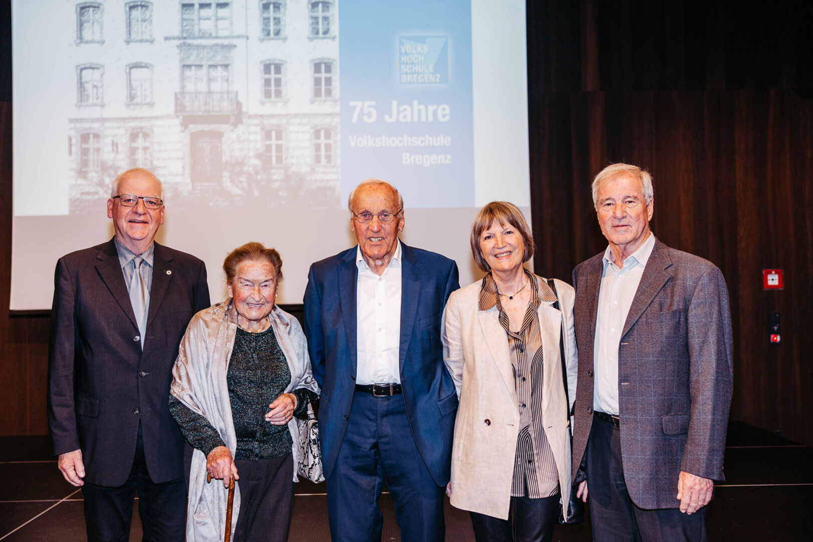 Im Bild oben: Vorne v. li.: LStH Barbara Schöbi-Fink und die Geehrten Günther Kapeller, Evelyn Marte-Stefani, Armin Greußing, Hermann Thüringer; Hinten v. li.: KO Roland Frühstück, StR. Michael Rauth, StR. Eveline Miessgang, Bgm. Michael Ritsch, VHS Generalsekretär John Evers, Obmann VHS Vorarlberg Stefan Fischnaller und VHS Bregenz GF Michael Grabher